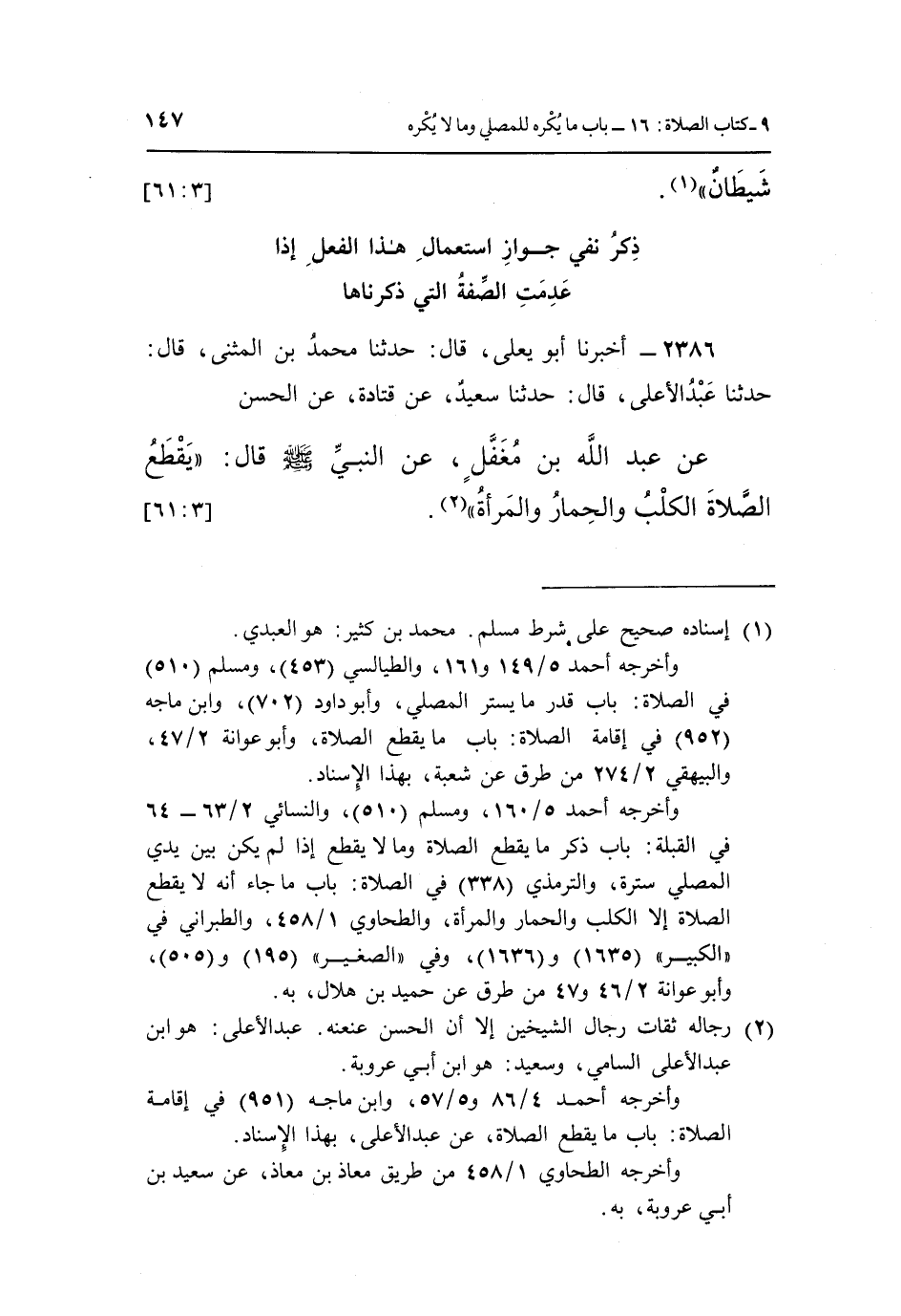 2386 - أَخْبَرَنَا أَبُو يَعْلَى، قَالَ: حَدَّثَنَا مُحَمَّدُ بْنُ الْمُثَنَّى، قَالَ: حَدَّثَنَا عَبْدُ الْأَعْلَى، قَالَ: حَدَّثَنَا سَعِيدٌ، عَنْ قَتَادَةَ، عَنِ الْحَسَنِ، عَنْ عَبْدِ اللَّهِ بْنِ مُغَفَّلٍ، عَنِ النَّبِيِّ صَلَّى اللَّهُ عَلَيْهِ وَسَلَّمَ، قَالَ: «يَقْطَعُ الصَّلَاةَ الْكَلْبُ وَالْحِمَارُ وَالْمَرْأَةُ» (¬2) . [3: 61]