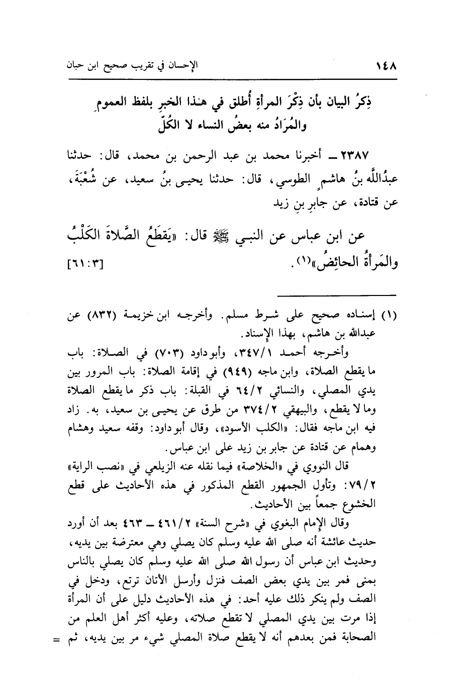 2387 - أَخْبَرَنَا مُحَمَّدُ بْنُ عَبْدِ الرَّحْمَنِ بْنِ مُحَمَّدٍ، قَالَ: حَدَّثَنَا عَبْدُ اللَّهِ بْنُ هَاشِمٍ الطُّوسِيُّ، قَالَ: حَدَّثَنَا يَحْيَى بْنُ سَعِيدٍ، عَنْ شُعْبَةَ، عَنْ قَتَادَةَ، عَنْ جَابِرِ بْنِ زَيْدٍ، عَنِ ابْنِ عَبَّاسٍ، عَنِ النَّبِيِّ صَلَّى اللَّهُ عَلَيْهِ وَسَلَّمَ، قَالَ: «يَقْطَعُ الصَّلَاةَ الْكَلْبُ وَالْمَرْأَةُ الْحَائِضُ» (¬1) . [3: 61]
