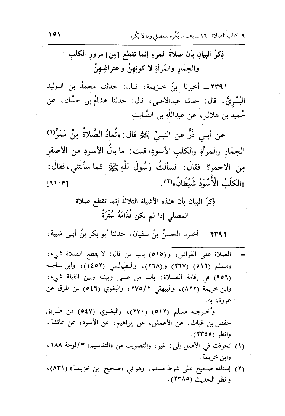 2391 - أَخْبَرَنَا ابْنُ خُزَيْمَةَ، قَالَ: حَدَّثَنَا مُحَمَّدُ بْنُ الْوَلِيدِ الْبُسْرِيُّ، قَالَ: حَدَّثَنَا عَبْدُ الْأَعْلَى، قَالَ: حَدَّثَنَا هِشَامُ بْنُ حَسَّانَ، عَنْ حُمَيْدِ بْنِ هِلَالٍ، عَنْ عَبْدِ اللَّهِ بْنِ الصَّامِتِ، عَنْ أَبِي ذَرٍّ، عَنِ النَّبِيِّ صَلَّى اللَّهُ عَلَيْهِ وَسَلَّمَ، قَالَ: «تُعَادُ الصَّلَاةُ مِنْ مَمَرِّ (¬1) الْحِمَارِ وَالْمَرْأَةِ وَالْكَلْبِ الْأَسْوَدِ» ، قُلْتُ: مَا بَالُ الْأَسْوَدِ مِنَ الْأَصْفَرِ مِنَ الْأَحْمَرِ؟ فَقَالَ: فَسَأَلْتُ رَسُولَ اللَّهِ صَلَّى اللَّهُ عَلَيْهِ وَسَلَّمَ كَمَا سَأَلْتَنِي، فَقَالَ: «الْكَلْبُ الْأَسْوَدُ شَيْطَانٌ» (¬2) . [3: 61]