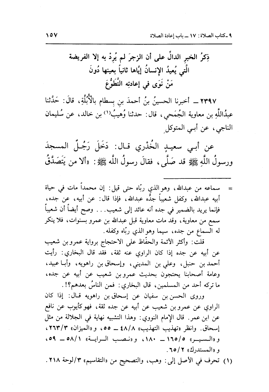 قلت: وأكثر الأئمة والحفّاظ على الاحتجاج برواية عمرو بن شعيب عن أبيه عن جده إذا كان الراوي عنه ثقة، فقد قال البخاري: رأيت أحمد بن حنبل، وعلي بن المديني، وإسحاق بن راهويه، وأبا عبيد، وعامة أصحابنا يحتجون بحديث عمرو بن شعيب عن أبيه عن جده، ما تركه أحد من المسلمين، قال البخاري: فمن الناسُ بعدهم؟!. وروى الحسن بن سفيان عن إسحاق بن راهويه قال: إذا كان الراوي عن عمرو بن شعيب عن أبيه عن جده ثقة، فهو كأيوب عن نافع عن ابن عمر. قال الإمام النووي: وهذا التشبيه نهاية في الجلالة من مثل إسحاق. وانظر "تهذيب التهذيب" 8/48-55، و"الميزان" 3/263، و"السير" 5/165-180، و"نصب الراية" 1/58-59، و"المستدرك" 2/65.