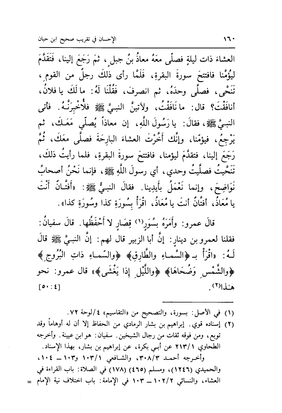 الْعِشَاءَ ذَاتَ لَيْلَةٍ فَصَلَّى مَعَهُ مُعَاذُ بْنُ جَبَلٍ، ثُمَّ رَجَعَ إِلَيْنَا فَتَقَدَّمَ لَيَؤُمَّنَا، فَافْتَتَحَ سُورَةَ الْبَقَرَةِ، فَلَمَّا رَأَى ذَلِكَ رَجُلٌ مِنَ الْقَوْمِ تَنَحَّى فَصَلَّى وَحْدَهُ، ثُمَّ انْصَرَفَ، فَقُلْنَا لَهُ: مَا لَكَ يَا فُلَانُ، أَنَافَقْتَ؟ قَالَ: مَا نَافَقْتُ، وَلَآتِيَنَّ النَّبِيَّ صَلَّى اللَّهُ عَلَيْهِ وَسَلَّمَ فَلَأُخْبِرَنَّهُ، فَأَتَى النَّبِيَّ صَلَّى اللَّهُ عَلَيْهِ وَسَلَّمَ، فَقَالَ: يَا رَسُولَ اللَّهِ، إِنَّ مُعَاذًا يُصَلِّي مَعَكَ، ثُمَّ يَرْجِعُ فَيَؤُمُّنَا، وَإِنَّكَ أَخَّرْتَ الْعِشَاءَ الْبَارِحَةَ فَصَلَّى مَعَكَ، ثُمَّ رَجَعَ إِلَيْنَا فَتَقَدَّمَ لَيَؤُمَّنَا، فَافْتَتَحَ سُورَةَ الْبَقَرَةِ، فَلَمَّا رَأَيْتُ ذَلِكَ تَنَحَّيْتُ فَصَلَّيْتُ وَحْدِي، أَيْ رَسُولَ اللَّهِ صَلَّى اللَّهُ عَلَيْهِ وَسَلَّمَ، فَإِنَّمَا نَحْنُ أَصْحَابُ نَوَاضِحَ، وَإِنَّمَا نَعْمَلُ بِأَيْدِينَا، فَقَالَ النَّبِيُّ صَلَّى اللَّهُ عَلَيْهِ وَسَلَّمَ: «أَفَتَّانٌ أَنْتَ يَا مُعَاذُ؟ أَفَتَّانٌ أَنْتَ يَا مُعَاذُ؟ اقْرَأْ بِسُورَةِ كَذَا وَسُورَةِ كَذَا»