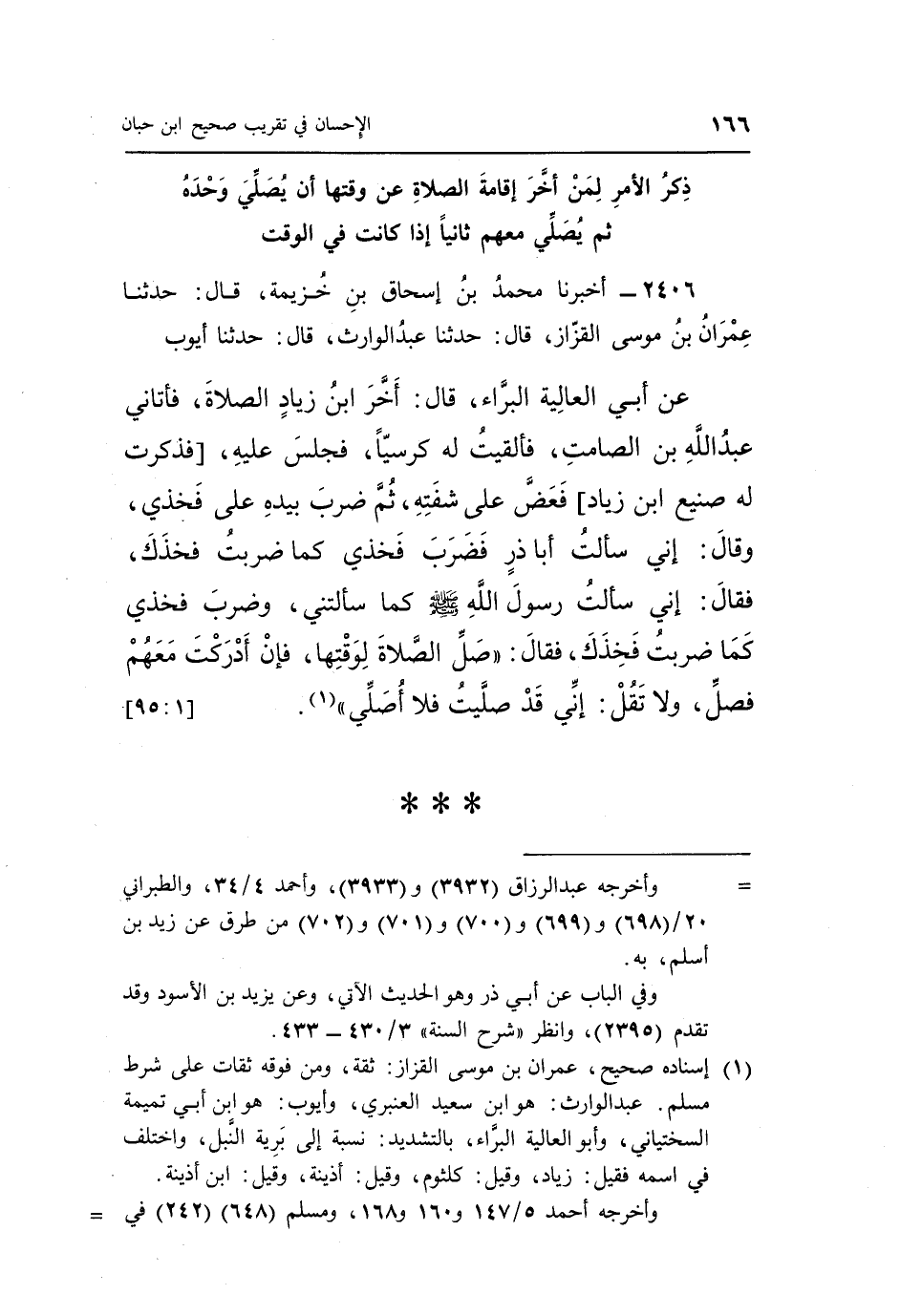 2406 - أَخْبَرَنَا مُحَمَّدُ بْنُ إِسْحَاقَ بْنِ خُزَيْمَةَ، قَالَ: حَدَّثَنَا عِمْرَانُ بْنُ مُوسَى الْقَزَّازُ، قَالَ: حَدَّثَنَا عَبْدِ الْوَارِثِ، قَالَ: حَدَّثَنَا أَيُّوبُ، عَنْ أَبِي الْعَالِيَةِ الْبَرَاءِ، قَالَ: أَخَّرَ ابْنُ زِيَادٍ الصَّلَاةَ، فَأَتَانِي عَبْدُ اللَّهِ بْنُ الصَّامِتِ، فَأَلْقَيْتُ لَهُ كُرْسِيًّا، فَجَلَسَ عَلَيْهِ، [فَذَكَرْتُ لَهُ صَنِيعَ ابْنِ زِيَادٍ] فَعَضَّ عَلَى شَفَتِهِ، ثُمَّ ضَرَبَ بِيَدِهِ عَلَى فَخِذِي، وَقَالَ: إِنِّي سَأَلْتُ أَبَا ذَرٍّ، فَضَرَبَ فَخِذِي كَمَا ضَرَبْتُ فَخِذَكَ، فَقَالَ: إِنِّي سَأَلْتُ رَسُولَ اللَّهِ صَلَّى اللَّهُ عَلَيْهِ وَسَلَّمَ كَمَا سَأَلْتَنِي، وَضَرَبَ فَخِذِي كَمَا ضَرَبْتُ فَخِذَكَ، فَقَالَ: «صَلِّ الصَّلَاةَ لِوَقْتِهَا، فَإِنْ أَدْرَكْتَ مَعَهُمْ فَصَلِّ، وَلَا تَقُلْ: إِنِّي قَدْ صَلَّيْتُ فَلَا أُصَلِّي» (¬1) .