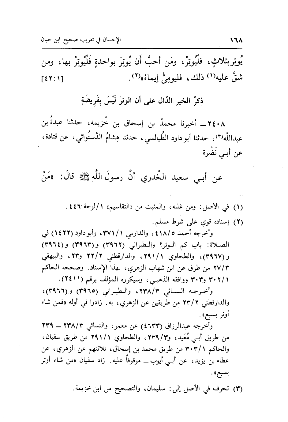 وأخرجه أحمد 5/418، والدارمي 1/371، وأبو داود (1422) في الصلاة: باب كم الوتر؟ والطبراني (3962) و (3963) و (3964) و (3967) ، والطحاوي 1/291، والدارقطني 2/22 و23، والبيهقي 3/27 من طرق عن ابن شهاب الزهري، بهذا الإِسناد. وصححه الحاكم 1/302 و303 ووافقه الذهبي، وسيكرره المؤلف برقم (2411) .