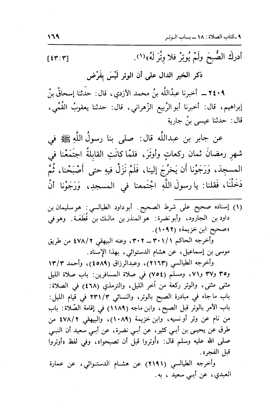 أَدْرَكَ الصُّبْحَ وَلَمْ يُوتِرْ فَلَا وِتْرَ لَهُ» (¬1) . [3: 43]