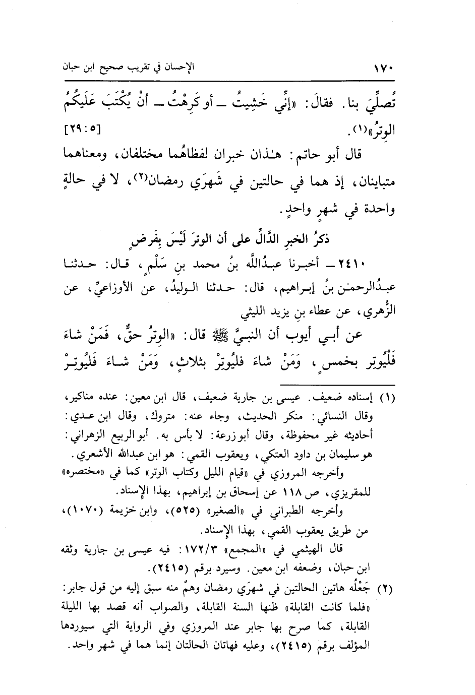 2410 - أَخْبَرَنَا عَبْدُ اللَّهِ بْنُ مُحَمَّدِ بْنِ سَلْمٍ، قَالَ: حَدَّثَنَا عَبْدُ الرَّحْمَنِ بْنُ إِبْرَاهِيمَ، قَالَ: حَدَّثَنَا الْوَلِيدُ، عَنِ الْأَوْزَاعِيِّ، عَنِ الزُّهْرِيِّ، عَنْ عَطَاءِ بْنِ يَزِيدَ اللَّيْثِيِّ، عَنْ أَبِي أَيُّوبَ، أَنَّ النَّبِيَّ صَلَّى اللَّهُ عَلَيْهِ وَسَلَّمَ قَالَ: «الْوِتْرُ حَقٌّ، فَمَنْ شَاءَ فَلْيُوتِرْ بِخَمْسٍ، وَمَنْ شَاءَ فَلْيُوتِرْ بِثَلَاثٍ، وَمَنْ شَاءَ فَلْيُوتِرْ