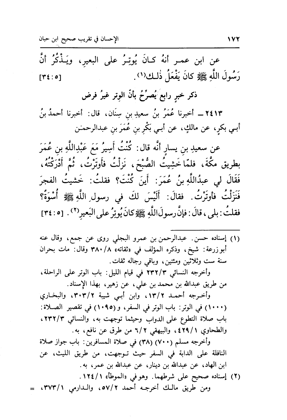 2413 - أَخْبَرَنَا عُمَرُ بْنُ سَعِيدِ بْنِ سِنَانٍ، قَالَ: أَخْبَرَنَا أَحْمَدُ بْنُ أَبِي بَكْرٍ، عَنْ مَالِكٍ، عَنْ أَبِي بَكْرِ بْنِ عُمَرَ بْنِ عَبْدِ الرَّحْمَنِ، عَنْ سَعِيدِ بْنِ يَسَارٍ، أَنَّهُ قَالَ: كُنْتُ أَسِيرُ مَعَ عَبْدِ اللَّهِ بْنِ عُمَرَ بِطَرِيقِ مَكَّةَ، فَلَمَّا خَشِيتُ الصُّبْحَ نَزَلْتُ فَأَوْتَرْتُ، ثُمَّ أَدْرَكْتُهُ، فَقَالَ لِي عَبْدُ اللَّهِ بْنُ عُمَرَ: أَيْنَ كُنْتَ؟ فَقُلْتُ: خَشِيتُ الْفَجْرَ فَنَزَلْتُ فَأَوْتَرْتُ، فَقَالَ: «أَلَيْسَ لَكَ فِي رَسُولِ اللَّهِ صَلَّى اللَّهُ عَلَيْهِ وَسَلَّمَ أُسْوَةٌ؟» فَقُلْتُ: بَلَى، قَالَ: «فَإِنَّ رَسُولَ اللَّهِ صَلَّى اللَّهُ عَلَيْهِ وَسَلَّمَ كَانَ يُوتِرُ عَلَى الْبَعِيرِ» (¬2) . [5: 34]