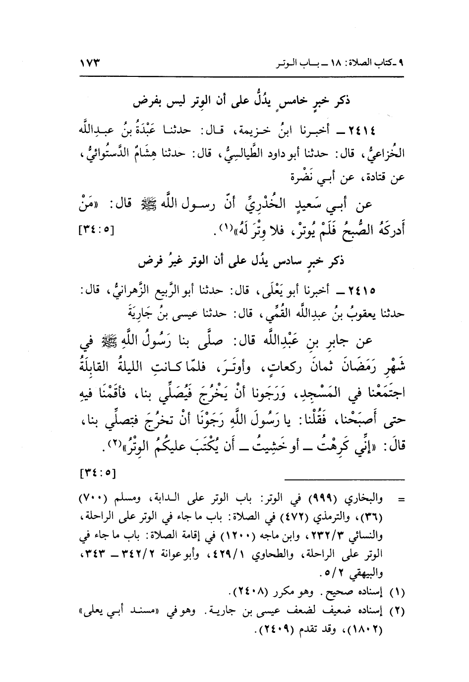 2415 - أَخْبَرَنَا أَبُو يَعْلَى، قَالَ: حَدَّثَنَا أَبُو الرَّبِيعِ الزَّهْرَانِيُّ، قَالَ: حَدَّثَنَا يَعْقُوبُ بْنُ عَبْدِ اللَّهِ الْقُمِّيُّ، قَالَ: حَدَّثَنَا عِيسَى بْنُ جَارِيَةَ، عَنْ جَابِرِ بْنِ عَبْدِ اللَّهِ، قَالَ: صَلَّى بِنَا رَسُولُ اللَّهِ صَلَّى اللَّهُ عَلَيْهِ وَسَلَّمَ فِي شَهْرِ رَمَضَانَ ثَمَانَ رَكَعَاتٍ، وَأَوْتَرَ، فَلَمَّا كَانَتِ اللَّيْلَةُ الْقَابِلَةُ اجْتَمَعْنَا فِي الْمَسْجِدِ، وَرَجَوْنَا أَنْ يَخْرُجَ فَيُصَلِّيَ بِنَا، فَأَقَمْنَا فِيهِ حَتَّى أَصْبَحْنَا، فَقُلْنَا: يَا رَسُولَ اللَّهِ، رَجَوْنَا أَنْ تَخْرُجَ فَتُصَلِّيَ بِنَا، قَالَ: «إِنِّي كَرِهْتُ - أَوْ خَشِيتُ - أَنْ يُكْتَبَ عَلَيْكُمُ الْوِتْرُ» (¬2) . [5: 34]