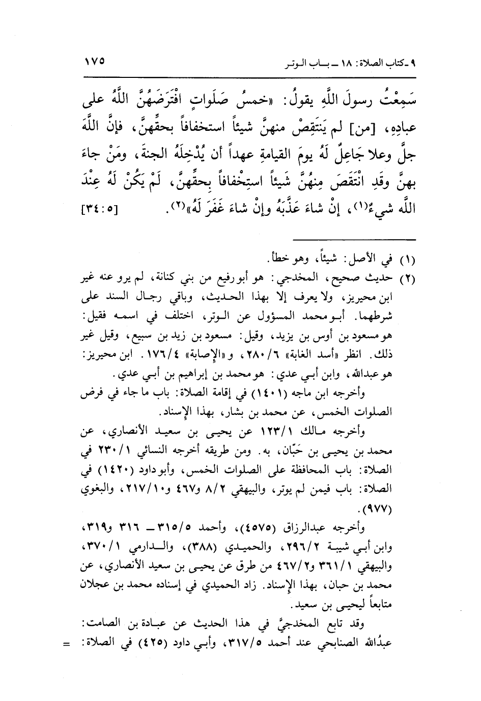 سَمِعْتُ رَسُولَ اللَّهِ صَلَّى اللَّهُ عَلَيْهِ وَسَلَّمَ يَقُولُ: «خَمْسُ صَلَوَاتٍ افْتَرَضَهُنَّ اللَّهُ عَلَى عِبَادِهِ، [مَنْ] لَمْ يَنْتَقِصْ مِنْهُنَّ شَيْئًا اسْتِخْفَافًا بِحَقِّهِنَّ، فَإِنَّ اللَّهَ جَلَّ وَعَلَا جَاعِلٌ لَهُ يَوْمَ الْقِيَامَةِ عَهْدًا أَنْ يُدْخِلَهُ الْجَنَّةَ، وَمَنْ جَاءَ بِهِنَّ وَقَدِ انْتَقَصَ مِنْهُنَّ شَيْئًا اسْتِخْفَافًا بِحَقِّهِنَّ، لَمْ يَكُنْ لَهُ عِنْدَ اللَّهِ شَيْءٌ (¬1) ، إِنْ شَاءَ عَذَّبَهُ، وَإِنْ شَاءَ غَفَرَ لَهُ» (¬2) . [5: 34]