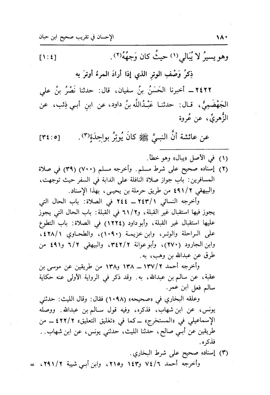 2422 - أَخْبَرَنَا الْحَسَنُ بْنُ سُفْيَانَ، قَالَ: حَدَّثَنَا نَصْرُ بْنُ عَلِيٍّ الْجَهْضَمِيُّ، قَالَ: حَدَّثَنَا عَبْدُ اللَّهِ بْنُ دَاوُدَ، عَنِ ابْنِ أَبِي ذِئْبٍ، عَنِ الزُّهْرِيِّ، عَنْ عُرْوَةَ، عَنْ عَائِشَةَ، «أَنَّ النَّبِيَّ صَلَّى اللَّهُ عَلَيْهِ وَسَلَّمَ كَانَ يُوتِرُ بِوَاحِدَةٍ» (¬3) . [5: 34]