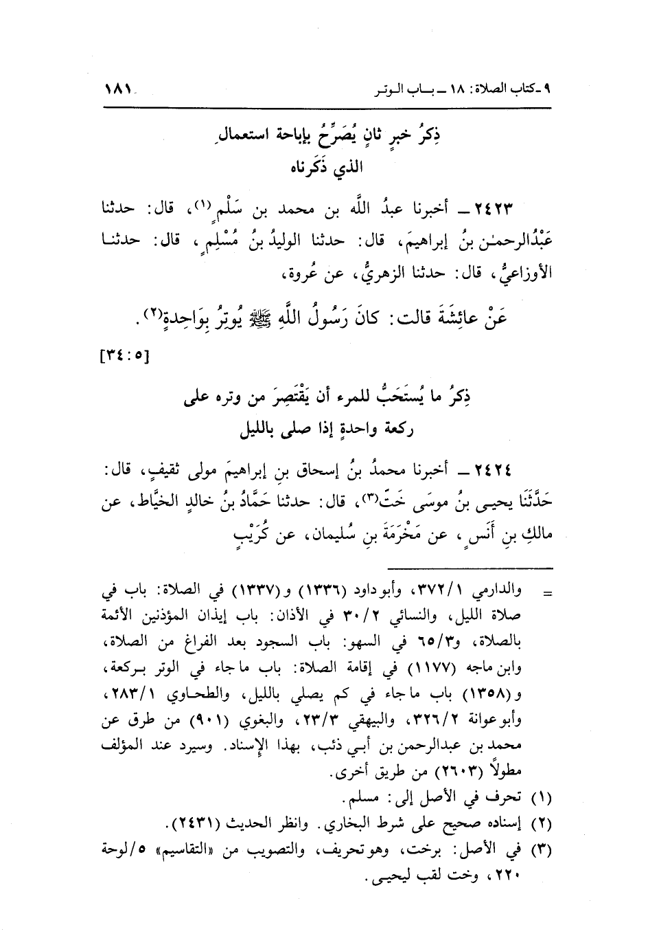 2423 - أَخْبَرَنَا عَبْدُ اللَّهِ بْنُ مُحَمَّدِ بْنِ سَلْمٍ (¬1) ، قَالَ: حَدَّثَنَا عَبْدُ الرَّحْمَنِ بْنُ إِبْرَاهِيمَ، قَالَ: حَدَّثَنَا الْوَلِيدُ بْنُ مُسْلِمٍ، قَالَ: حَدَّثَنَا الْأَوْزَاعِيُّ، قَالَ: حَدَّثَنَا الزُّهْرِيُّ، عَنْ عُرْوَةَ، عَنْ عَائِشَةَ، قَالَتْ: «كَانَ رَسُولُ اللَّهِ صَلَّى اللَّهُ عَلَيْهِ وَسَلَّمَ يُوتِرُ بِوَاحِدَةٍ» (¬2) . [5: 34]