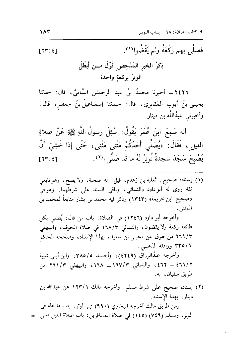 2426 - أَخْبَرَنَا مُحَمَّدُ بْنُ عَبْدِ الرَّحْمَنِ السَّامِيُّ، قَالَ: حَدَّثَنَا يَحْيَى بْنُ أَيُّوبَ الْمَقَابِرِيُّ، قَالَ: حَدَّثَنَا إِسْمَاعِيلُ بْنُ جَعْفَرٍ، قَالَ: وَأَخْبَرَنِي عَبْدُ اللَّهِ بْنُ دِينَارٍ، أَنَّهُ سَمِعَ ابْنَ عُمَرَ يَقُولُ: سُئِلَ رَسُولُ اللَّهِ صَلَّى اللَّهُ عَلَيْهِ وَسَلَّمَ عَنْ صَلَاةِ اللَّيْلِ، فَقَالَ: «يُصَلِّي أَحَدُكُمْ مَثْنَى مَثْنَى، حَتَّى إِذَا خَشِيَ أَنْ يُصْبِحَ سَجَدَ سَجْدَةً تُوتِرُ لَهُ مَا قَدْ صَلَّى» (¬2) . [4: 23]