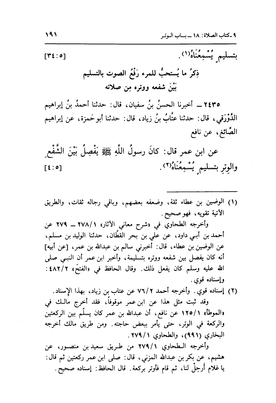 2435 - أَخْبَرَنَا الْحَسَنُ بْنُ سُفْيَانَ، قَالَ: حَدَّثَنَا أَحْمَدُ بْنُ إِبْرَاهِيمَ الدَّوْرَقِيُّ، قَالَ: حَدَّثَنَا عَتَّابُ بْنُ زِيَادٍ، قَالَ: حَدَّثَنَا أَبُو حَمْزَةَ، عَنْ إِبْرَاهِيمَ الصَّائِغِ، عَنْ نَافِعٍ، عَنِ ابْنِ عُمَرَ، قَالَ: «كَانَ رَسُولُ اللَّهِ صَلَّى اللَّهُ عَلَيْهِ وَسَلَّمَ يَفْصِلُ بَيْنَ الشَّفْعِ وَالْوِتْرِ بِتَسْلِيمٍ يُسْمِعُنَاهُ» (¬2) . [5: 4]