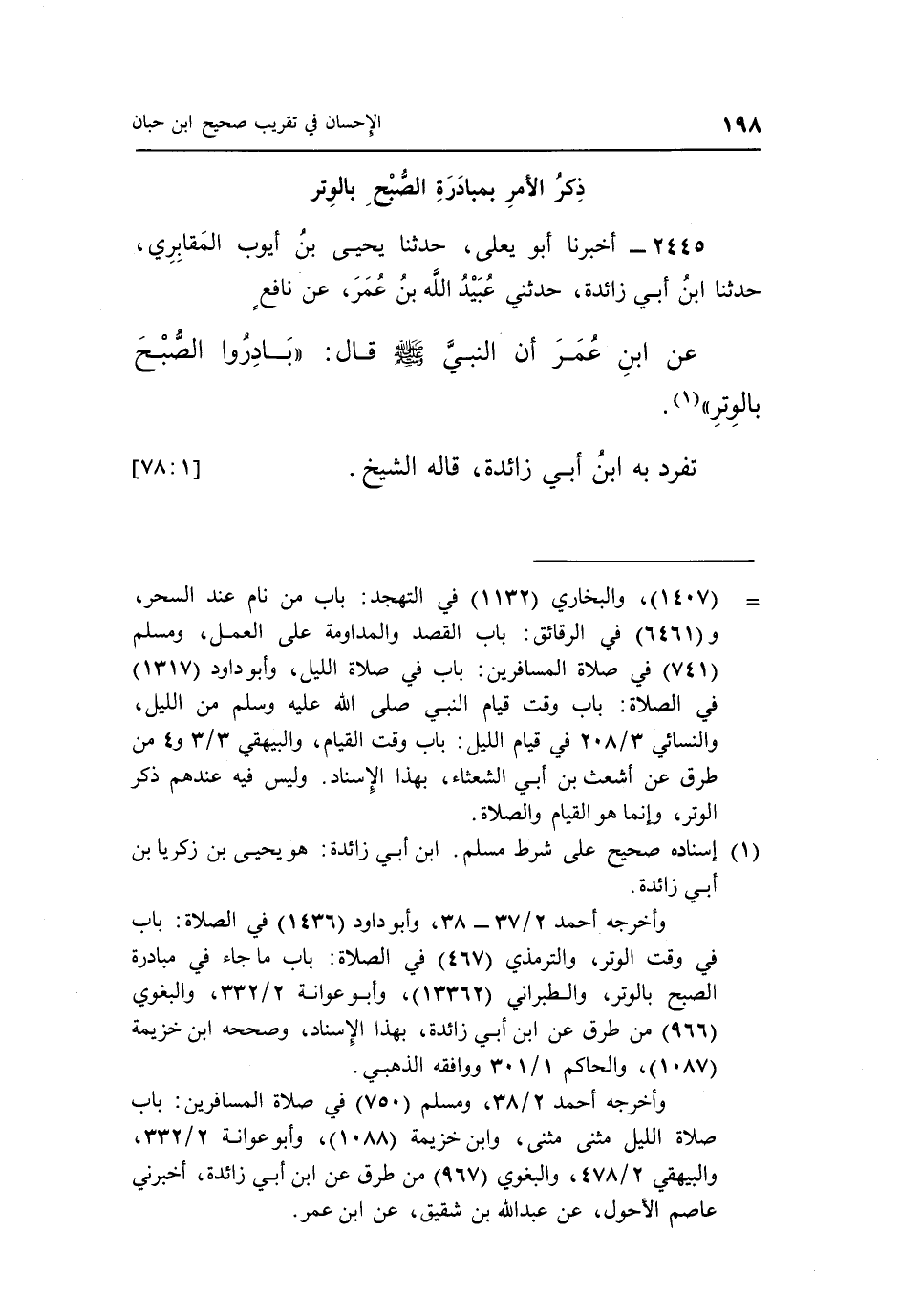 2445 - أَخْبَرَنَا أَبُو يَعْلَى، حَدَّثَنَا يَحْيَى بْنُ أَيُّوبَ الْمَقَابِرِيُّ، حَدَّثَنَا ابْنُ أَبِي زَائِدَةَ، حَدَّثَنِي عُبَيْدُ اللَّهِ بْنُ عُمَرَ، عَنْ نَافِعٍ، عَنِ ابْنِ عُمَرَ، أَنَّ النَّبِيَّ صَلَّى اللَّهُ عَلَيْهِ وَسَلَّمَ قَالَ: «بَادِرُوا الصُّبْحَ بِالْوِتْرِ» (¬1) .
