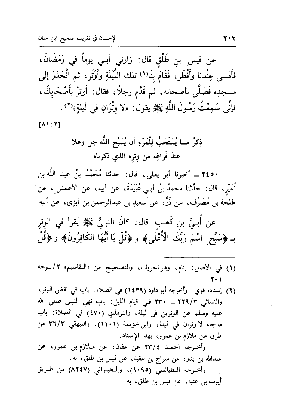 عَنْ قَيْسِ بْنِ طَلْقٍ، قَالَ: زَارَنِي أَبِي يَوْمًا فِي رَمَضَانَ، فَأَمْسَى عِنْدَنَا وَأَفْطَرَ، فَقَامَ بِنَا (¬1) تِلْكَ اللَّيْلَةَ وَأَوْتَرَ، ثُمَّ انْحَدَرَ إِلَى مَسْجِدِهِ فَصَلَّى بِأَصْحَابِهِ، ثُمَّ قَدَّمَ رَجُلًا، فَقَالَ: أَوْتِرْ بِأَصْحَابِكَ، فَإِنِّي سَمِعْتُ رَسُولَ اللَّهِ صَلَّى اللَّهُ عَلَيْهِ وَسَلَّمَ يَقُولُ: «لَا وِتْرَانِ فِي لَيْلَةٍ» (¬2) . [2: 81]