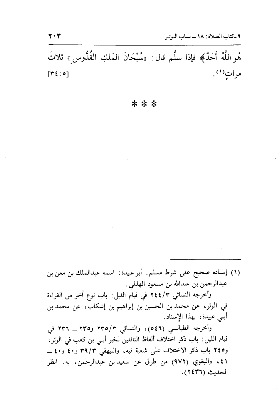 هُوَ اللَّهُ أَحَدٌ} فَإِذَا سَلَّمَ قَالَ: سُبْحَانَ الْمَلِكِ الْقُدُّوسِ» ثَلَاثَ مَرَّاتٍ (¬1) . [5: 34]