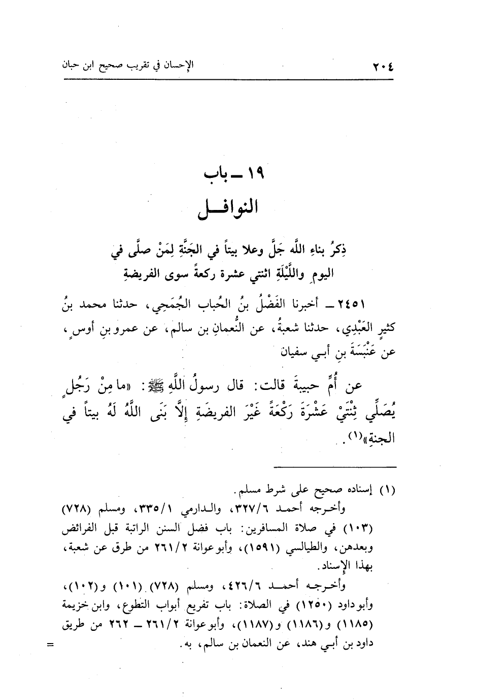 2451 - أَخْبَرَنَا الْفَضْلُ بْنُ الْحُبَابِ الْجُمَحِيُّ، حَدَّثَنَا مُحَمَّدُ بْنُ كَثِيرٍ الْعَبْدِيُّ، حَدَّثَنَا شُعْبَةُ، عَنِ النُّعْمَانِ بْنِ سَالِمٍ، عَنْ عَمْرِو بْنِ أَوْسٍ، عَنْ عَنْبَسَةَ بْنِ أَبِي سُفْيَانَ، عَنْ أُمِّ حَبِيبَةَ، قَالَتْ: قَالَ رَسُولُ اللَّهِ صَلَّى اللَّهُ عَلَيْهِ وَسَلَّمَ: «مَا مِنْ رَجُلٍ يُصَلِّي ثِنْتَيْ عَشْرَةَ رَكْعَةً غَيْرَ الْفَرِيضَةِ إِلَّا بَنَى اللَّهُ لَهُ بَيْتًا فِي الْجَنَّةِ» (¬1) .