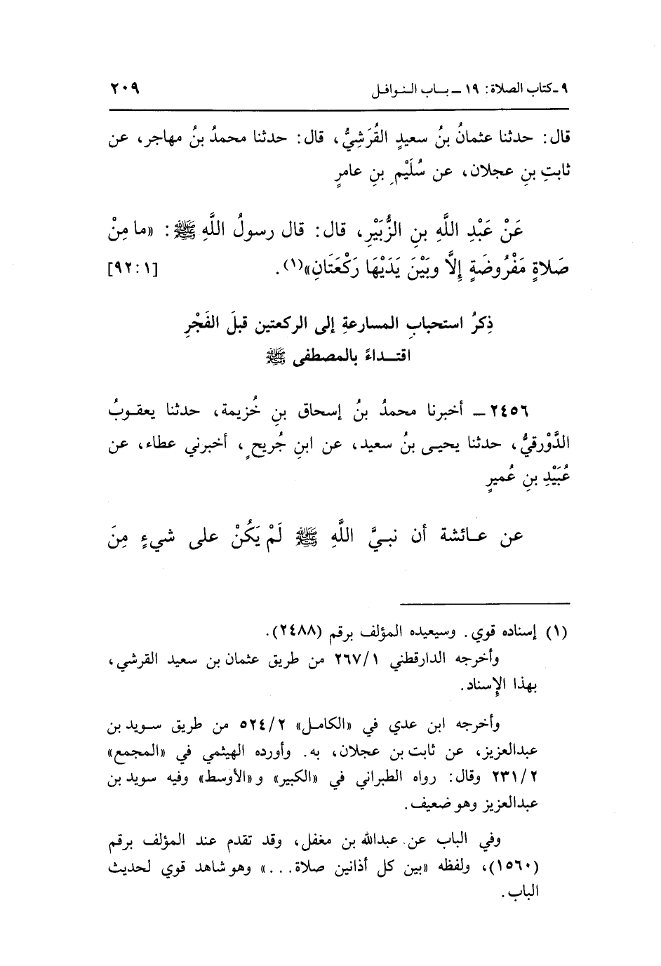 قَالَ: حَدَّثَنَا عُثْمَانُ بْنُ سَعِيدٍ الْقُرَشِيُّ، قَالَ: حَدَّثَنَا مُحَمَّدُ بْنُ مُهَاجِرٍ، عَنْ ثَابِتِ بْنِ عَجْلَانَ، عَنْ سُلَيْمِ بْنِ عَامِرٍ، عَنْ عَبْدِ اللَّهِ بْنِ الزُّبَيْرِ، قَالَ: قَالَ رَسُولُ اللَّهِ صَلَّى اللَّهُ عَلَيْهِ وَسَلَّمَ: «مَا مِنْ صَلَاةٍ مَفْرُوضَةٍ إِلَّا وَبَيْنَ يَدَيْهَا رَكْعَتَانِ» (¬1) . [1: 92]