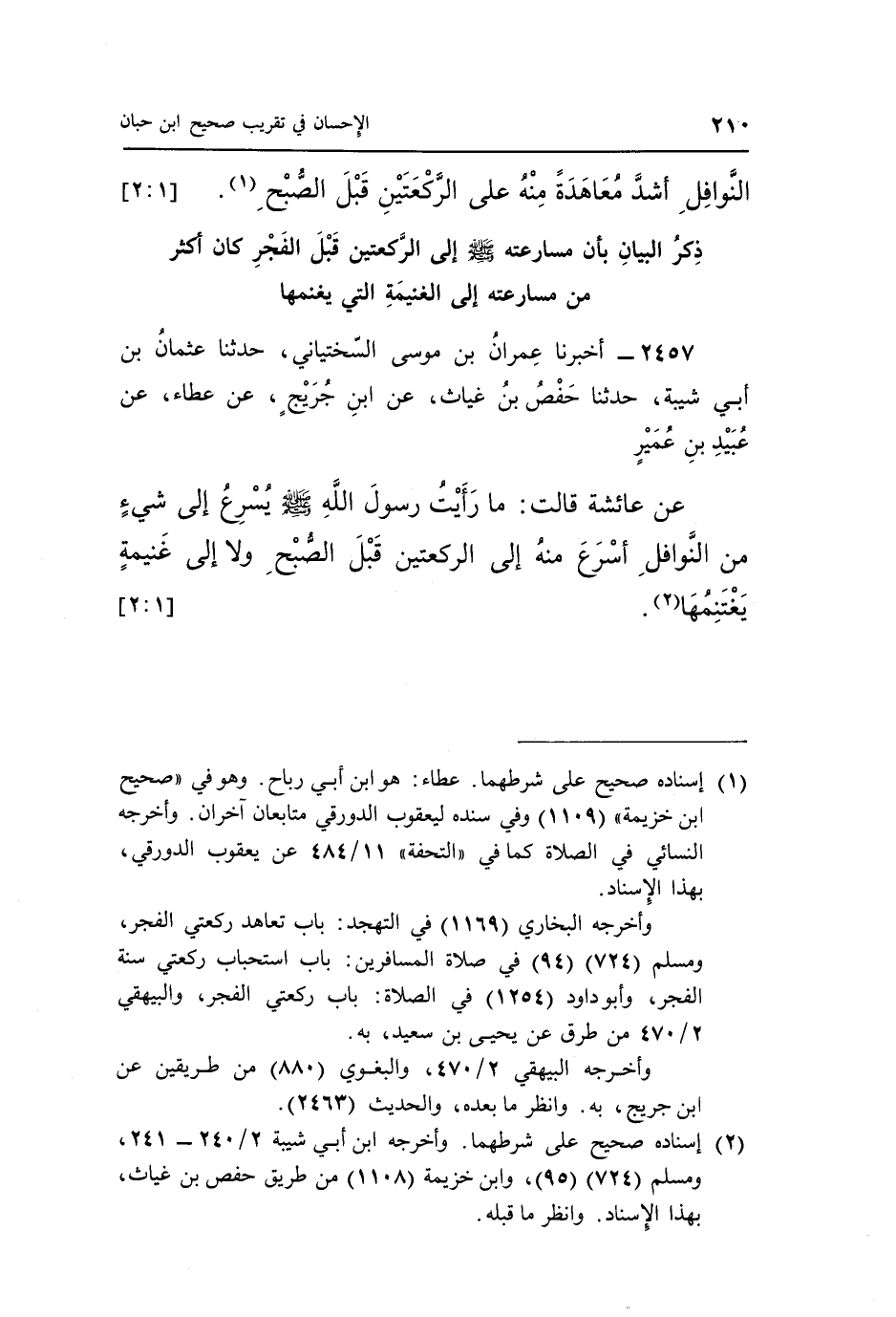 2457 - أَخْبَرَنَا عِمْرَانُ بْنُ مُوسَى السَّخْتِيَانِيُّ، حَدَّثَنَا عُثْمَانُ بْنُ أَبِي شَيْبَةَ، حَدَّثَنَا حَفْصُ بْنُ غِيَاثٍ، عَنِ ابْنِ جُرَيْجٍ، عَنْ عَطَاءٍ، عَنْ عُبَيْدِ بْنِ عُمَيْرٍ، عَنْ عَائِشَةَ قَالَتْ: «مَا رَأَيْتُ رَسُولَ اللَّهِ صَلَّى اللَّهُ عَلَيْهِ وَسَلَّمَ يُسْرِعُ إِلَى شَيْءٍ مِنَ النَّوَافِلِ أَسْرَعَ مِنْهُ إِلَى الرَّكْعَتَيْنِ قَبْلَ الصُّبْحِ وَلَا إِلَى غَنِيمَةٍ يَغْتَنِمُهَا» (¬2) . [1: 2]