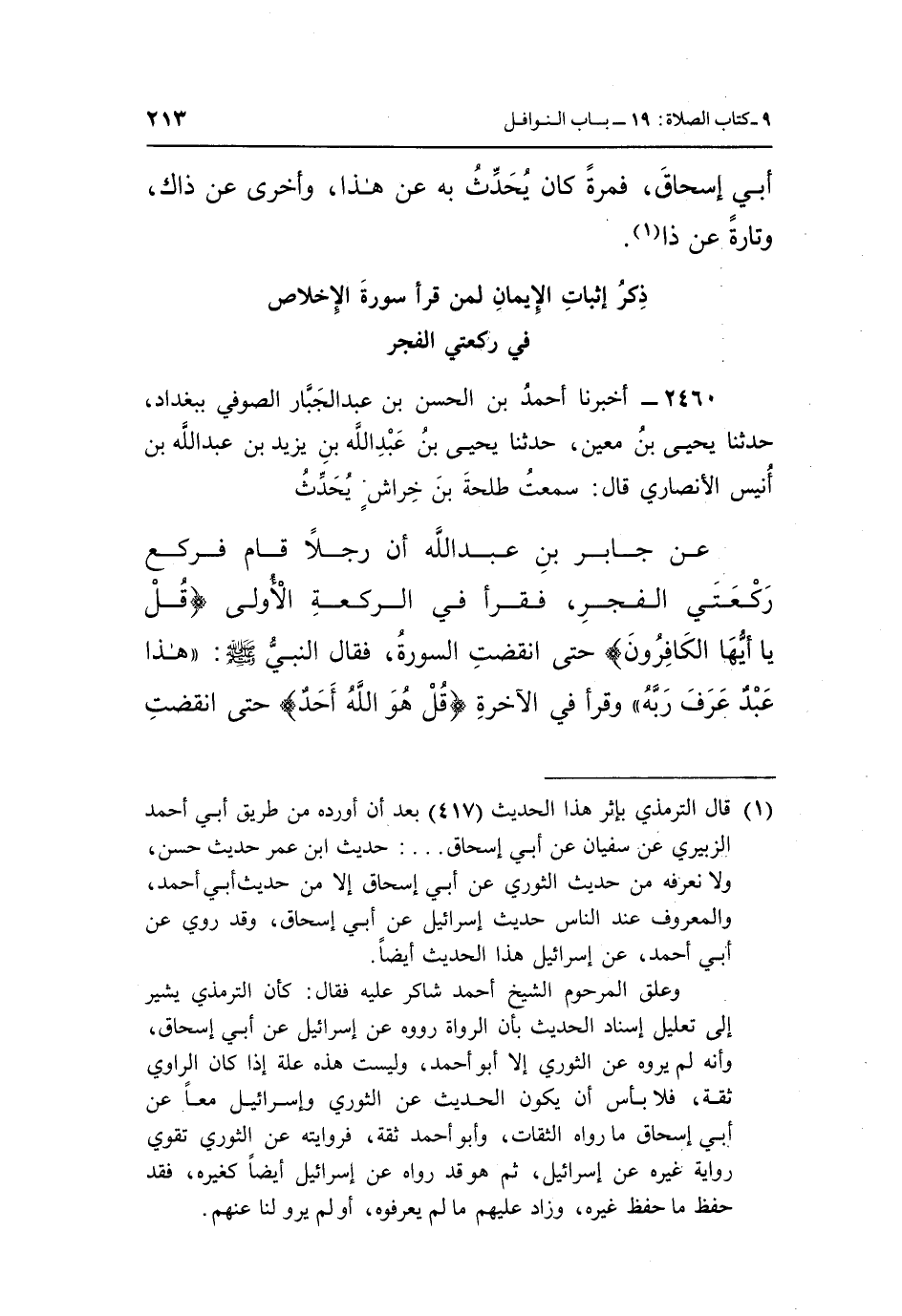 2460 - أَخْبَرَنَا أَحْمَدُ بْنُ الْحَسَنِ بْنِ عَبْدِ الْجَبَّارِ الصُّوفِيُّ بِبَغْدَادَ، حَدَّثَنَا يَحْيَى بْنُ مَعِينٍ، حَدَّثَنَا يَحْيَى بْنُ عَبْدِ اللَّهِ بْنِ يَزِيدَ بْنِ عَبْدِ اللَّهِ بْنِ أُنَيْسٍ الْأَنْصَارِيُّ، قَالَ: سَمِعْتُ طَلْحَةَ بْنَ خِرَاشٍ يُحَدِّثُ، عَنْ جَابِرِ بْنِ عَبْدِ اللَّهِ، أَنَّ رَجُلًا قَامَ فَرَكَعَ رَكْعَتَيِ الْفَجْرِ، فَقَرَأَ فِي الرَّكْعَةِ الْأُولَى: {قُلْ يَا أَيُّهَا الْكَافِرُونَ} حَتَّى انْقَضَتِ السُّورَةُ، فَقَالَ النَّبِيُّ صَلَّى اللَّهُ عَلَيْهِ وَسَلَّمَ: «هَذَا عَبْدٌ عَرَفَ رَبَّهُ» ، وَقَرَأَ فِي الْآخِرَةِ: {قُلْ هُوَ اللَّهُ أَحَدٌ} حتى انقضتِ