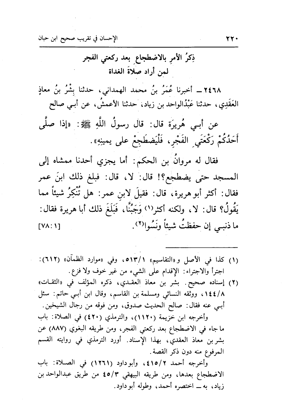 2468 - أَخْبَرَنَا عُمَرُ بْنُ مُحَمَّدٍ الْهَمْدَانِيُّ، حَدَّثَنَا بِشْرُ بْنُ مُعَاذٍ الْعَقَدِيُّ، حَدَّثَنَا عَبْدُ الْوَاحِدِ بْنُ زِيَادٍ، حَدَّثَنَا الْأَعْمَشُ، عَنْ أَبِي صَالِحٍ، عَنْ أَبِي هُرَيْرَةَ قَالَ: قَالَ رَسُولُ اللَّهِ صَلَّى اللَّهُ عَلَيْهِ وَسَلَّمَ: «إِذَا صَلَّى أَحَدُكُمْ رَكْعَتَيِ الْفَجْرِ فَلْيَضْطَجِعْ عَلَى يَمِينِهِ» فَقَالَ لَهُ مَرْوَانُ بْنُ الْحَكَمِ: أَمَا يَجْزِي أَحَدُنَا مَمْشَاهُ إِلَى الْمَسْجِدِ حَتَّى يَضْطَجِعَ؟ قَالَ: لَا، قَالَ: فَبَلَغَ ذَلِكَ ابْنَ عُمَرَ، فَقَالَ: أَكْثَرَ أَبُو هُرَيْرَةَ قَالَ: فَقِيلَ لِابْنِ عُمَرَ: هَلْ تُنْكِرُ شَيْئًا مِمَّا يَقُولُ؟ قَالَ: لَا، وَلَكِنَّهُ أَكْثَرَ (¬1) وَجَبُنَّا، فَبَلَغَ ذَلِكَ أَبَا هُرَيْرَةَ فَقَالَ: «مَا ذَنْبِي إِنْ حَفِظْتُ شَيْئًا وَنَسُوا» (¬2) . [1: 78]