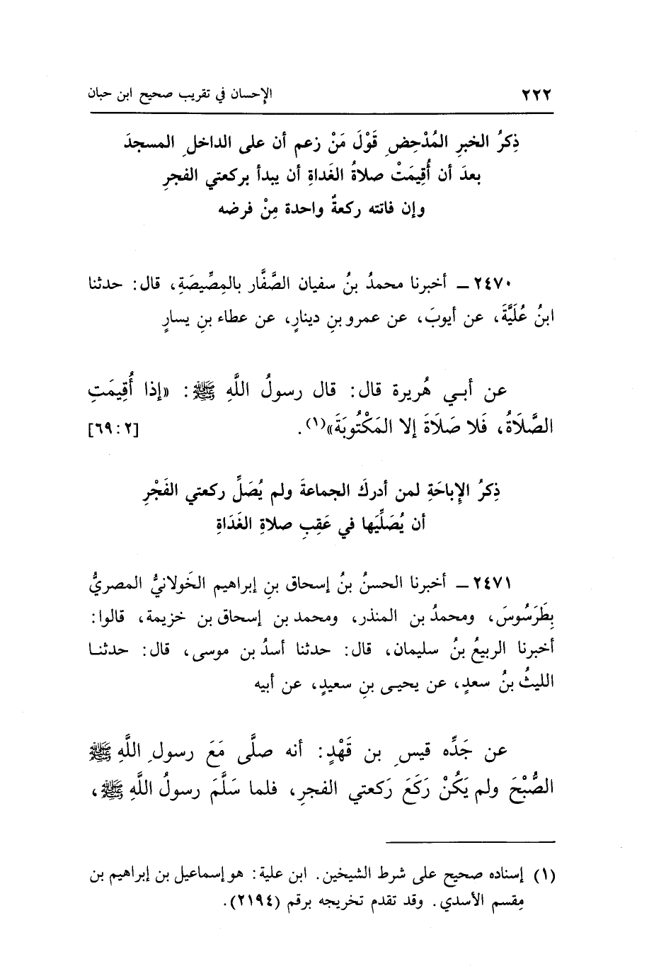 2471 - أَخْبَرَنَا الْحَسَنُ بْنُ إِسْحَاقَ بْنِ إِبْرَاهِيمَ الْخَوْلَانِيُّ الْمِصْرِيُّ بِطَرَسُوسَ، وَمُحَمَّدُ بْنُ الْمُنْذِرِ، وَمُحَمَّدُ بْنُ إِسْحَاقَ بْنِ خُزَيْمَةَ، قَالُوا: أَخْبَرَنَا الرَّبِيعُ بْنُ سُلَيْمَانَ، قَالَ: حَدَّثَنَا أَسَدُ بْنُ مُوسَى، قَالَ: حَدَّثَنَا اللَّيْثُ بْنُ سَعْدٍ، عَنْ يَحْيَى بْنِ سَعِيدٍ، عَنْ أَبِيهِ، عَنْ جَدِّهِ قَيْسِ بْنِ قَهْدٍ، «أَنَّهُ صَلَّى مَعَ رَسُولِ اللَّهِ صَلَّى اللَّهُ عَلَيْهِ وَسَلَّمَ الصُّبْحَ، وَلَمْ يَكُنْ رَكَعَ رَكْعَتَيِ الْفَجْرِ، فَلَمَّا سَلَّمَ رَسُولُ اللَّهِ صَلَّى اللَّهُ عَلَيْهِ وَسَلَّمَ،