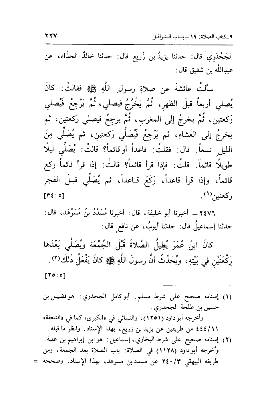2476 - أَخْبَرَنَا أَبُو خَلِيفَةَ، قَالَ: أَخْبَرَنَا مُسَدَّدُ بْنُ مُسَرْهَدٍ، قَالَ: حَدَّثَنَا إِسْمَاعِيلُ، قَالَ: حَدَّثَنَا أَيُّوبُ، عَنْ نَافِعٍ، قَالَ: كَانَ ابْنُ عُمَرَ «يُطِيلُ الصَّلَاةَ قَبْلَ الْجُمُعَةِ، وَيُصَلِّي بَعْدَهَا رَكْعَتَيْنِ فِي بَيْتِهِ» ، وَيُحَدِّثُ «أَنَّ رَسُولَ اللَّهِ صَلَّى اللَّهُ عَلَيْهِ وَسَلَّمَ كَانَ يَفْعَلُ ذَلِكَ» (¬2) . [5: 25]