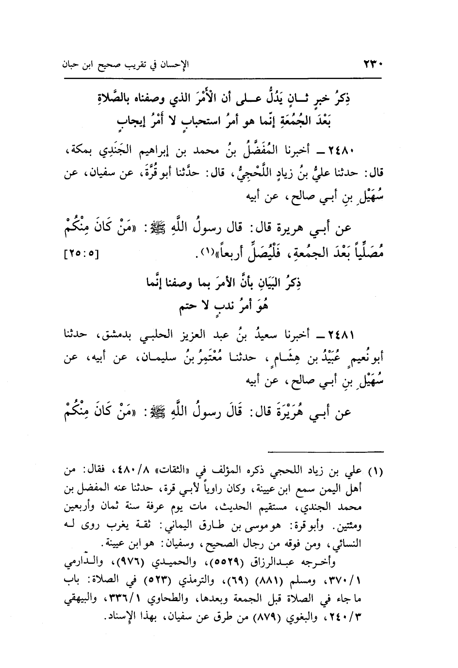 2480 - أَخْبَرَنَا الْمُفَضَّلُ بْنُ مُحَمَّدِ بْنِ إِبْرَاهِيمَ الْجَنَدِيُّ بِمَكَّةَ، قَالَ: حَدَّثَنَا عَلِيُّ بْنُ زِيَادٍ اللَّحْجِيُّ، قَالَ: حَدَّثَنَا أَبُو قُرَّةَ، عَنْ سُفْيَانَ، عَنْ سُهَيْلِ بْنِ أَبِي صَالِحٍ، عَنْ أَبِيهِ، عَنْ أَبِي هُرَيْرَةَ، قَالَ: قَالَ رَسُولُ اللَّهِ صَلَّى اللَّهُ عَلَيْهِ وَسَلَّمَ: «مَنْ كَانَ مِنْكُمْ مُصَلِّيًا بَعْدَ الْجُمُعَةِ فَلْيُصَلِّ أَرْبَعًا» (¬1) . [5: 25]