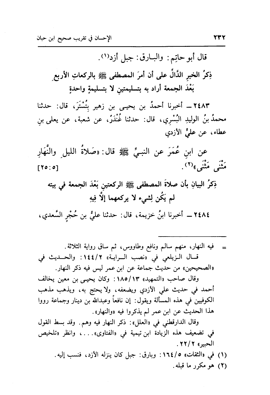 2483 - أَخْبَرَنَا أَحْمَدُ بْنُ يَحْيَى بْنِ زُهَيْرٍ بِتُسْتُرَ، قَالَ: حَدَّثَنَا مُحَمَّدُ بْنُ الْوَلِيدِ الْبُسْرِيُّ، قَالَ: حَدَّثَنَا غُنْدَرٌ، عَنْ شُعْبَةَ، عَنْ يَعْلَى بْنِ عَطَاءٍ، عَنْ عَلِيٍّ الْأَزْدِيِّ، عَنِ ابْنِ عُمَرَ، عَنِ النَّبِيِّ صَلَّى اللَّهُ عَلَيْهِ وَسَلَّمَ قَالَ: «صَلَاةُ اللَّيْلِ وَالنَّهَارِ مَثْنَى مَثْنَى» (¬2) . [5: 25]