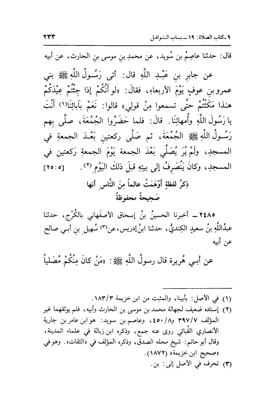 قَالَ: حَدَّثَنَا عَاصِمُ بْنُ سُوَيْدٍ، عَنْ مُحَمَّدِ بْنِ مُوسَى بْنِ الْحَارِثِ، عَنْ أَبِيهِ، عَنْ جَابِرِ بْنِ عَبْدِ اللَّهِ قَالَ: أَتَى رَسُولُ اللَّهِ صَلَّى اللَّهُ عَلَيْهِ وَسَلَّمَ بَنِي عَمْرِو بْنِ عَوْفٍ يَوْمَ الْأَرْبِعَاءِ، فَقَالَ: «لَوْ أَنَّكُمْ إِذَا جِئْتُمْ عِيدَكُمْ هَذَا مَكَثْتُمْ حَتَّى تَسْمَعُوا مِنْ قَوْلِي» ، قَالُوا: نَعَمْ، بِآبَائِنَا (¬1) أَنْتَ يَا رَسُولَ اللَّهِ وَأُمَّهَاتِنَا، قَالَ: فَلَمَّا حَضَرُوا الْجُمُعَةَ صَلَّى بِهِمْ رَسُولُ اللَّهِ صَلَّى اللَّهُ عَلَيْهِ وَسَلَّمَ الْجُمُعَةَ، ثُمَّ صَلَّى رَكْعَتَيْنِ بَعْدَ الْجُمُعَةِ فِي الْمَسْجِدِ، وَلَمْ يُرَ يُصَلِّي بَعْدَ الْجُمُعَةِ يَوْمَ الْجُمُعَةِ رَكْعَتَيْنِ فِي الْمَسْجِدِ، وَكَانَ يَنْصَرِفُ إِلَى بَيْتِهِ قَبْلَ ذَلِكَ الْيَوْمِ (¬2) . [5: 25]