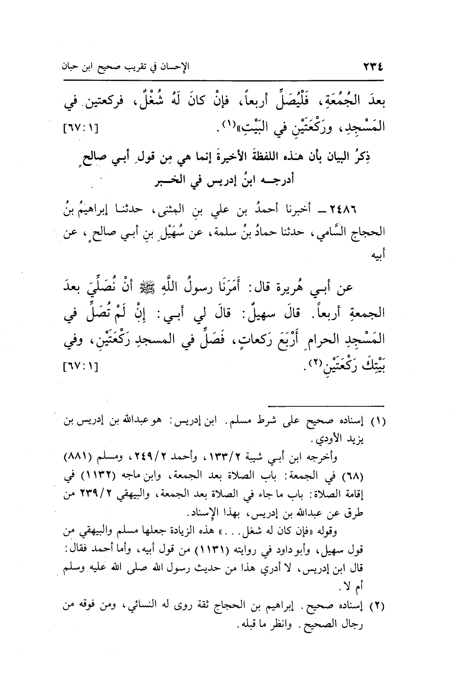 2486 - أَخْبَرَنَا أَحْمَدُ بْنُ عَلِيِّ بْنِ الْمُثَنَّى، حَدَّثَنَا إِبْرَاهِيمُ بْنُ الْحَجَّاجِ السَّامِيُّ، حَدَّثَنَا حَمَّادُ بْنُ سَلَمَةَ، عَنْ سُهَيْلِ بْنِ أَبِي صَالِحٍ، عَنْ أَبِيهِ، عَنْ أَبِي هُرَيْرَةَ، قَالَ: «أَمَرَنَا رَسُولُ اللَّهِ صَلَّى اللَّهُ عَلَيْهِ وَسَلَّمَ أَنْ نُصَلِّيَ بَعْدَ الْجُمُعَةِ أَرْبَعًا»