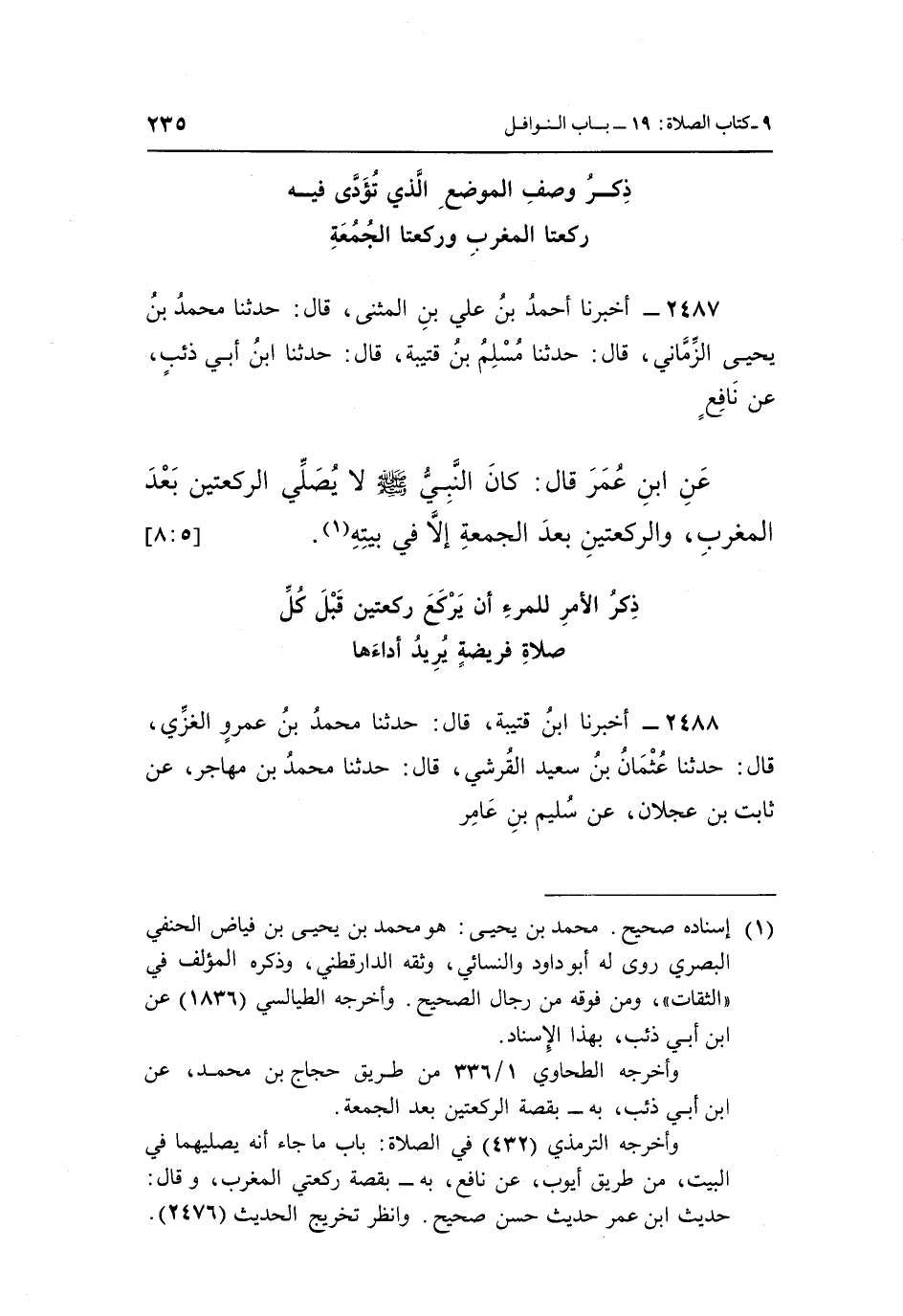 2487 - أَخْبَرَنَا أَحْمَدُ بْنُ عَلِيِّ بْنِ الْمُثَنَّى، قَالَ: حَدَّثَنَا مُحَمَّدُ بْنُ يَحْيَى الزِّمَّانِيُّ، قَالَ: حَدَّثَنَا سَلْمُ بْنُ قُتَيْبَةَ، قَالَ: حَدَّثَنَا ابْنُ أَبِي ذِئْبٍ، عَنْ نَافِعٍ، عَنِ ابْنِ عُمَرَ، قَالَ: «كَانَ النَّبِيُّ صَلَّى اللَّهُ عَلَيْهِ وَسَلَّمَ لَا يُصَلِّي الرَّكْعَتَيْنِ بَعْدَ الْمَغْرِبِ، وَالرَّكْعَتَيْنِ بَعْدَ الْجُمُعَةِ، إِلَّا فِي بَيْتِهِ» (¬1) . [5: 8]