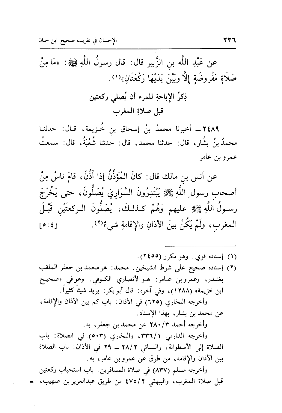 2489 - أَخْبَرَنَا مُحَمَّدُ بْنُ إِسْحَاقَ بْنِ خُزَيْمَةَ، قَالَ: حَدَّثَنَا مُحَمَّدُ بْنُ بَشَّارٍ، قَالَ: حَدَّثَنَا مُحَمَّدٌ، قَالَ: حَدَّثَنَا شُعْبَةُ، قَالَ: سَمِعْتُ عَمْرَو بْنَ عَامِرٍ، عَنْ أَنَسِ بْنِ مَالِكٍ، قَالَ: «كَانَ الْمُؤَذِّنُ إِذَا أَذَّنَ قَامَ نَاسٌ مِنْ أَصْحَابِ رَسُولِ اللَّهِ صَلَّى اللَّهُ عَلَيْهِ وَسَلَّمَ يَبْتَدِرُونَ السَّوَارِيَ يُصَلُّونَ، حَتَّى يَخْرُجَ رَسُولُ اللَّهِ صَلَّى اللَّهُ عَلَيْهِ وَسَلَّمَ عَلَيْهِمْ وَهُمْ كَذَلِكَ، يُصَلُّونَ الرَّكْعَتَيْنِ قَبْلَ الْمَغْرِبِ، وَلَمْ يَكُنْ بَيْنَ الْأَذَانِ وَالْإِقَامَةِ شَيْءٌ» (¬2) . [4: 5]
