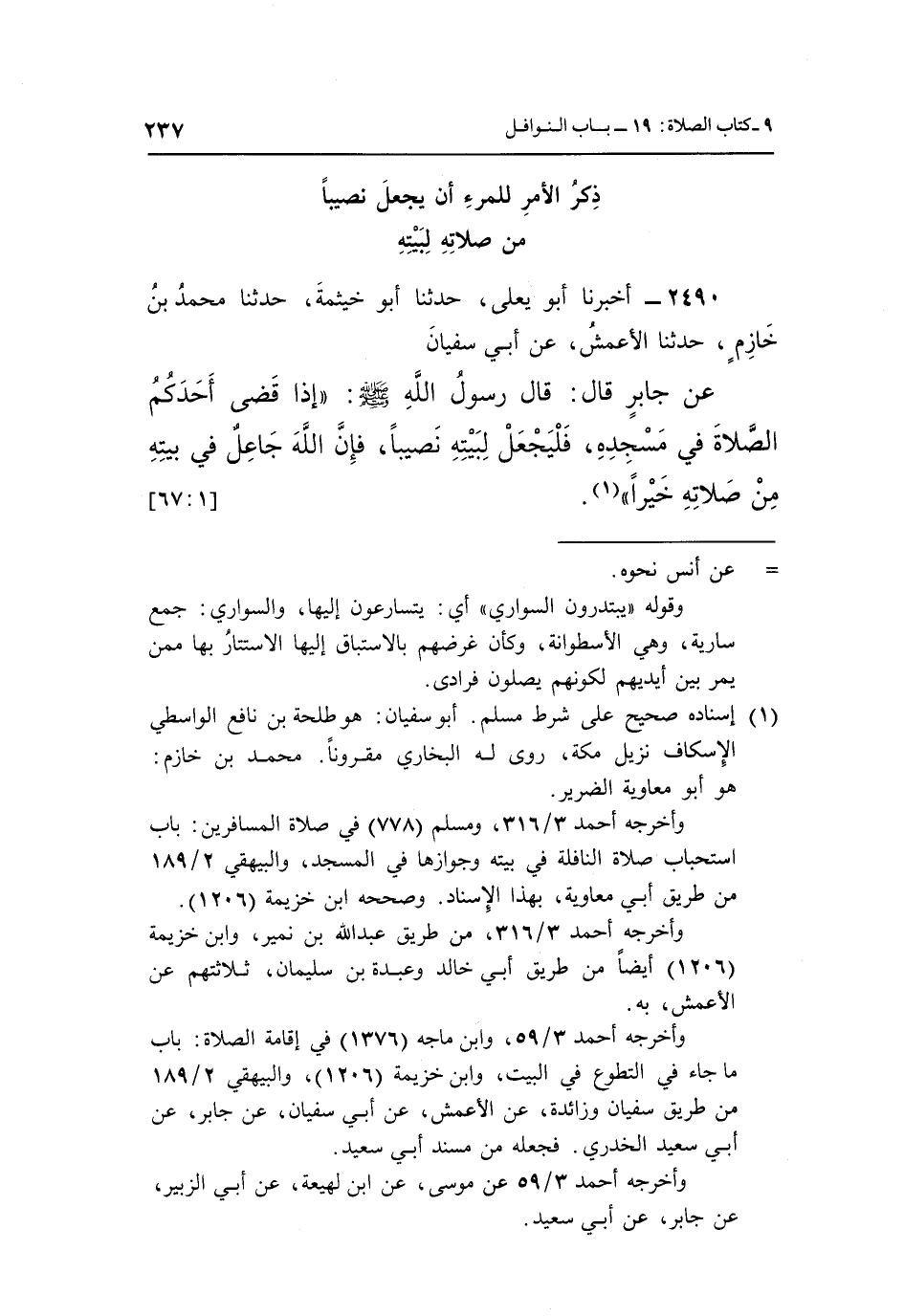 2490 - أَخْبَرَنَا أَبُو يَعْلَى، حَدَّثَنَا أَبُو خَيْثَمَةَ، حَدَّثَنَا مُحَمَّدُ بْنُ خَازِمٍ، حَدَّثَنَا الْأَعْمَشُ، عَنْ أَبِي سُفْيَانَ، عَنْ جَابِرٍ، قَالَ: قَالَ رَسُولُ اللَّهِ صَلَّى اللَّهُ عَلَيْهِ وَسَلَّمَ: «إِذَا قَضَى أَحَدُكُمُ الصَّلَاةَ فِي مَسْجِدِهِ فَلْيَجْعَلْ لِبَيْتِهِ نَصِيبًا، فَإِنَّ اللَّهَ جَاعِلٌ فِي بَيْتِهِ مِنْ صَلَاتِهِ خَيْرًا» (¬1) . [1: 67]