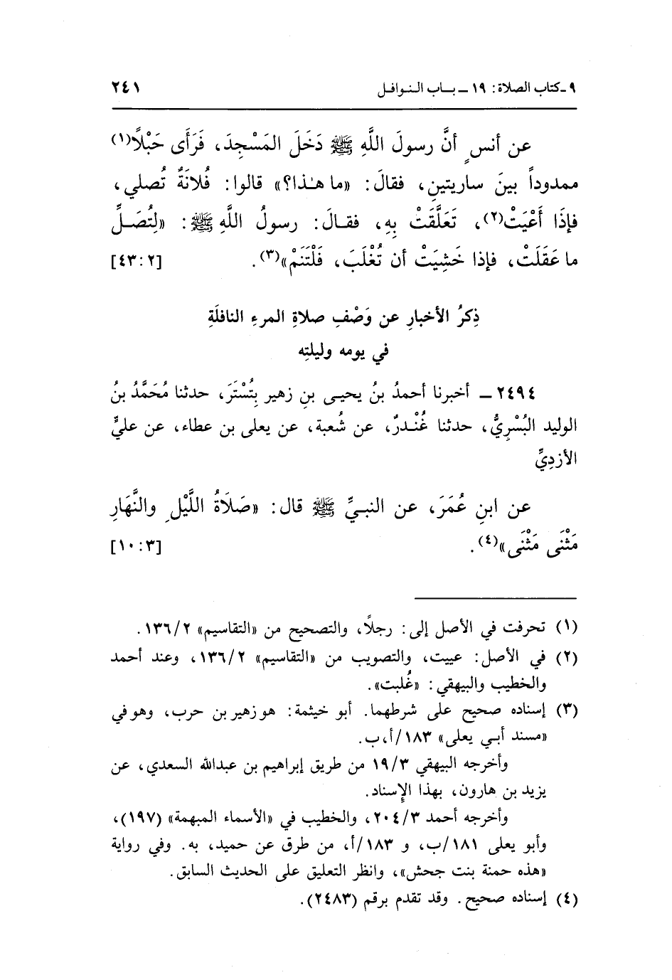 عَنْ أَنَسٍ، أَنَّ رَسُولَ اللَّهِ صَلَّى اللَّهُ عَلَيْهِ وَسَلَّمَ دَخَلَ الْمَسْجِدَ، فَرَأَى حَبْلًا (¬1) مَمْدُودًا بَيْنَ سَارِيَتَيْنِ، فَقَالَ: «مَا هَذَا؟» قَالُوا: فُلَانَةٌ تُصَلِّي فَإِذَا أَعْيَتْ (¬2) تَعَلَّقَتْ بِهِ، فَقَالَ رَسُولُ اللَّهِ صَلَّى اللَّهُ عَلَيْهِ وَسَلَّمَ: «لِتُصَلِّ مَا عَقَلَتْ، فَإِذَا خَشِيَتْ أَنْ تُغْلَبَ فَلْتَنَمْ» (¬3) . [2: 43]