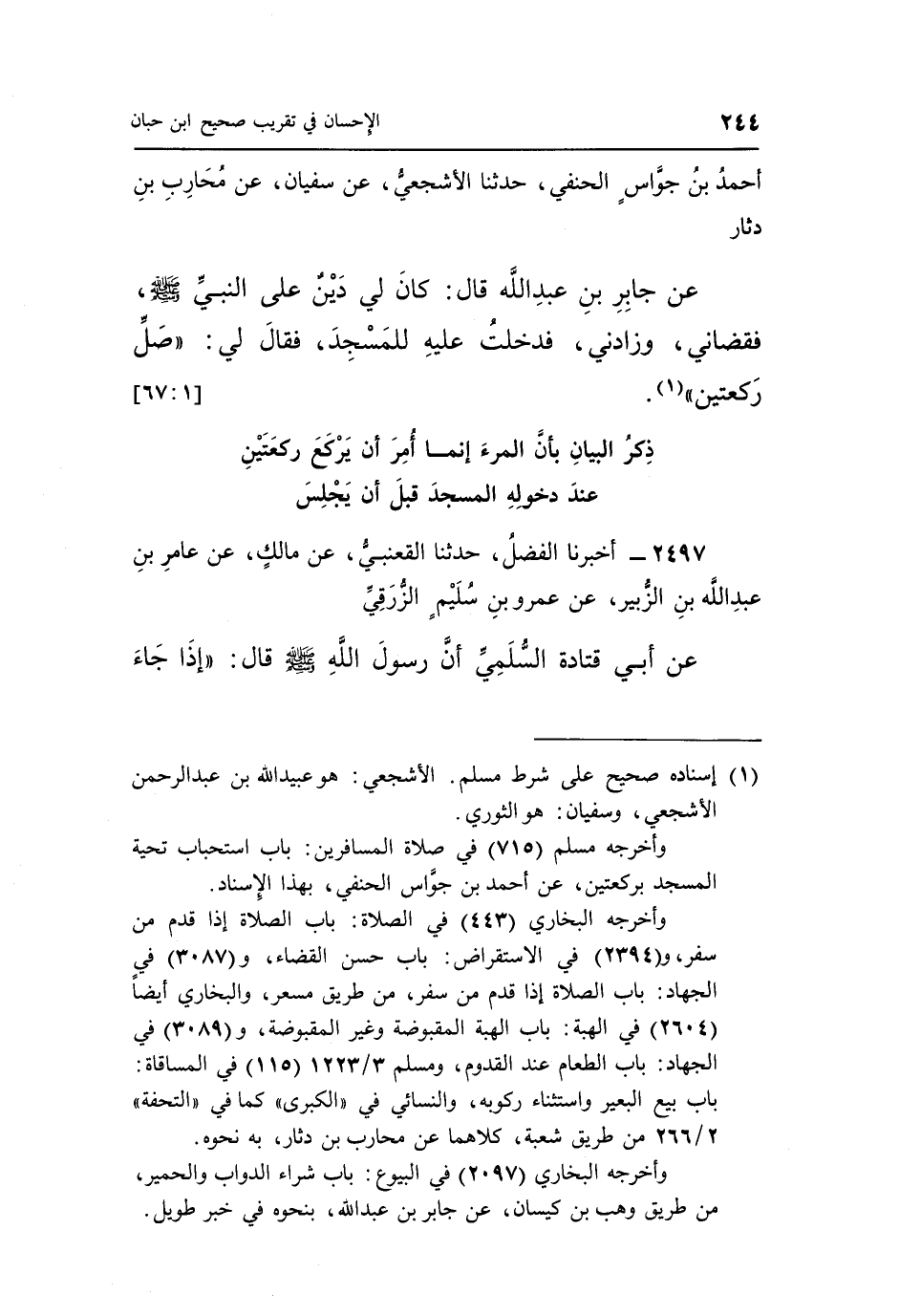 أَحْمَدُ بْنُ جَوَّاسٍ الْحَنَفِيُّ، حَدَّثَنَا الْأَشْجَعِيُّ، عَنْ سُفْيَانَ، عَنْ مُحَارِبِ بْنِ دِثَارٍ، عَنْ جَابِرِ بْنِ عَبْدِ اللَّهِ، قَالَ: كَانَ لِي دَيْنٌ عَلَى النَّبِيِّ صَلَّى اللَّهُ عَلَيْهِ وَسَلَّمَ، فَقَضَانِي وَزَادَنِي، فَدَخَلْتُ عَلَيْهِ الْمَسْجِدَ، فَقَالَ لِي: «صَلِّ رَكْعَتَيْنِ» (¬1) .