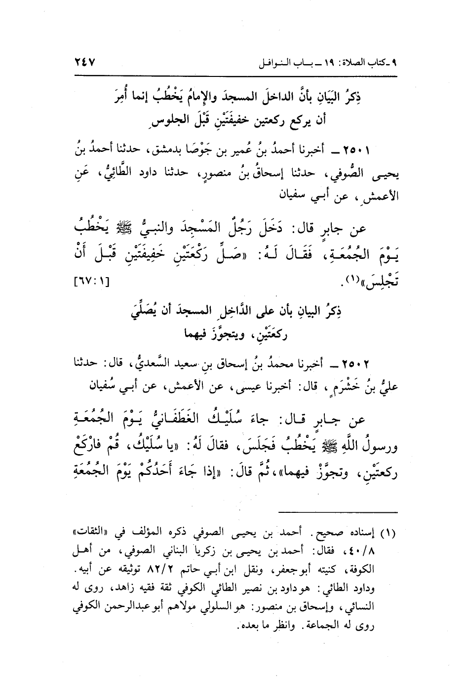 2501 - أَخْبَرَنَا أَحْمَدُ بْنُ عُمَيْرِ بْنِ جَوْصَا بِدِمَشْقَ، حَدَّثَنَا أَحْمَدُ بْنُ يَحْيَى الصُّوفِيُّ، حَدَّثَنَا إِسْحَاقُ بْنُ مَنْصُورٍ، حَدَّثَنَا دَاوُدُ الطَّائِيُّ، عَنِ الْأَعْمَشِ، عَنْ أَبِي سُفْيَانَ، عَنْ جَابِرٍ قَالَ: دَخَلَ رَجُلٌ الْمَسْجِدَ، وَالنَّبِيُّ صَلَّى اللَّهُ عَلَيْهِ وَسَلَّمَ يَخْطُبُ يَوْمَ الْجُمُعَةِ، فَقَالَ لَهُ: «صَلِّ رَكْعَتَيْنِ خَفِيفَتَيْنِ قَبْلَ أَنْ تَجْلِسَ» (¬1) . [1: 67]