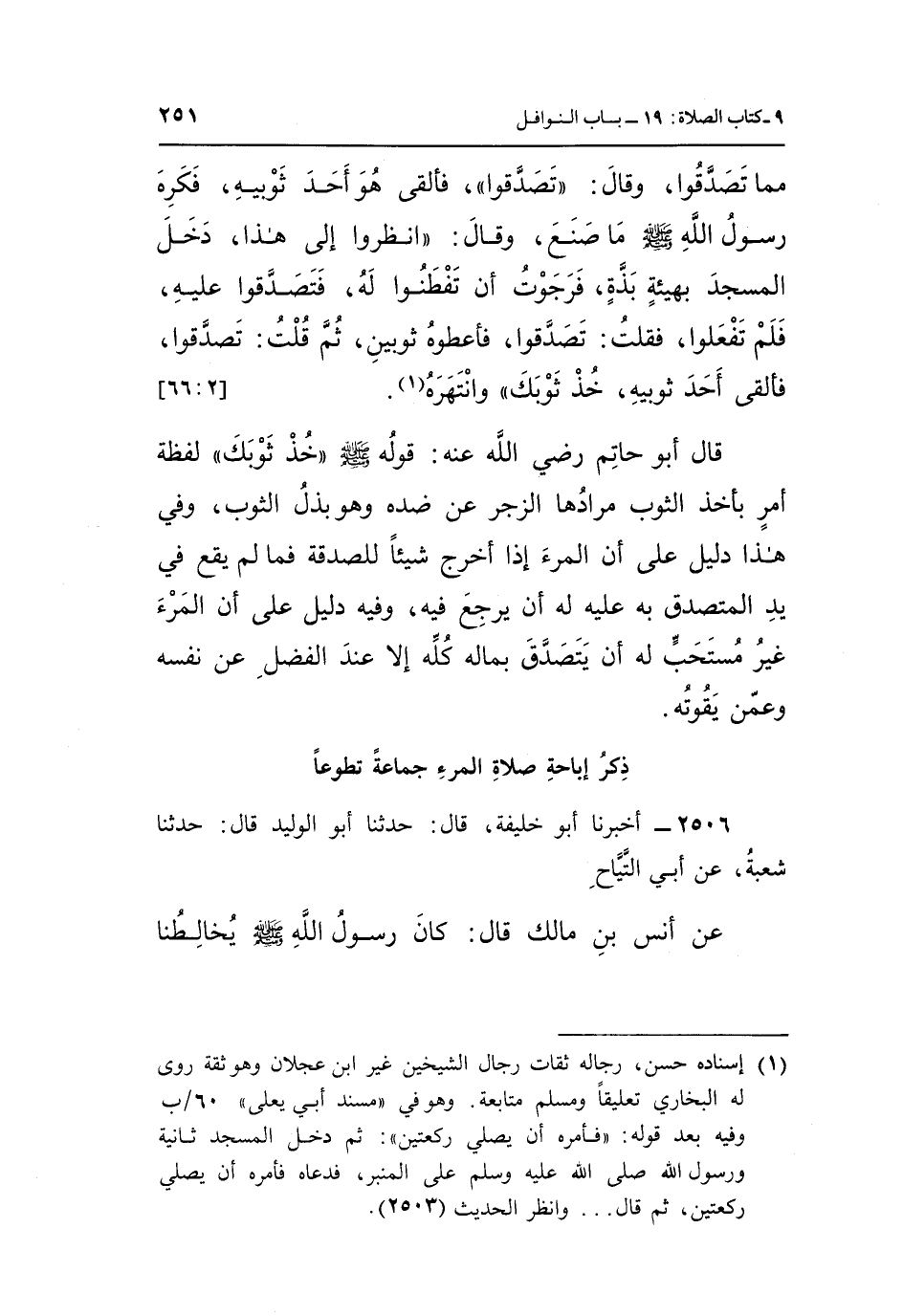 قَالَ أَبُو حَاتِمٍ رَضِيَ اللَّهُ عَنْهُ: قَوْلُهُ صَلَّى اللَّهُ عَلَيْهِ وَسَلَّمَ: «خُذْ ثَوْبَكَ» ، لَفْظَةُ أَمْرٍ بِأَخْذِ الثَّوْبِ مُرَادُهَا الزَّجْرُ عَنْ ضِدِّهِ وَهُوَ بَذْلُ الثَّوْبِ، وَفِي هَذَا دَلِيلٌ عَلَى أَنَّ الْمَرْءَ إِذَا أَخْرَجَ شَيْئًا لِلصَّدَقَةِ فَمَا لَمْ يَقَعْ فِي يَدِ الْمُتَصَدِّقِ بِهِ عَلَيْهِ لَهُ أَنْ يَرْجِعَ فِيهِ، وَفِيهِ دَلِيلٌ عَلَى أَنَّ الْمَرْءَ غَيْرُ مُسْتَحَبٍّ لَهُ أَنْ يَتَصَدَّقَ بِمَالِهِ كُلِّهِ إِلَّا عِنْدَ الْفَضْلِ عَنْ نَفْسِهِ وَعَمَّنْ يَقُوتُهُ.