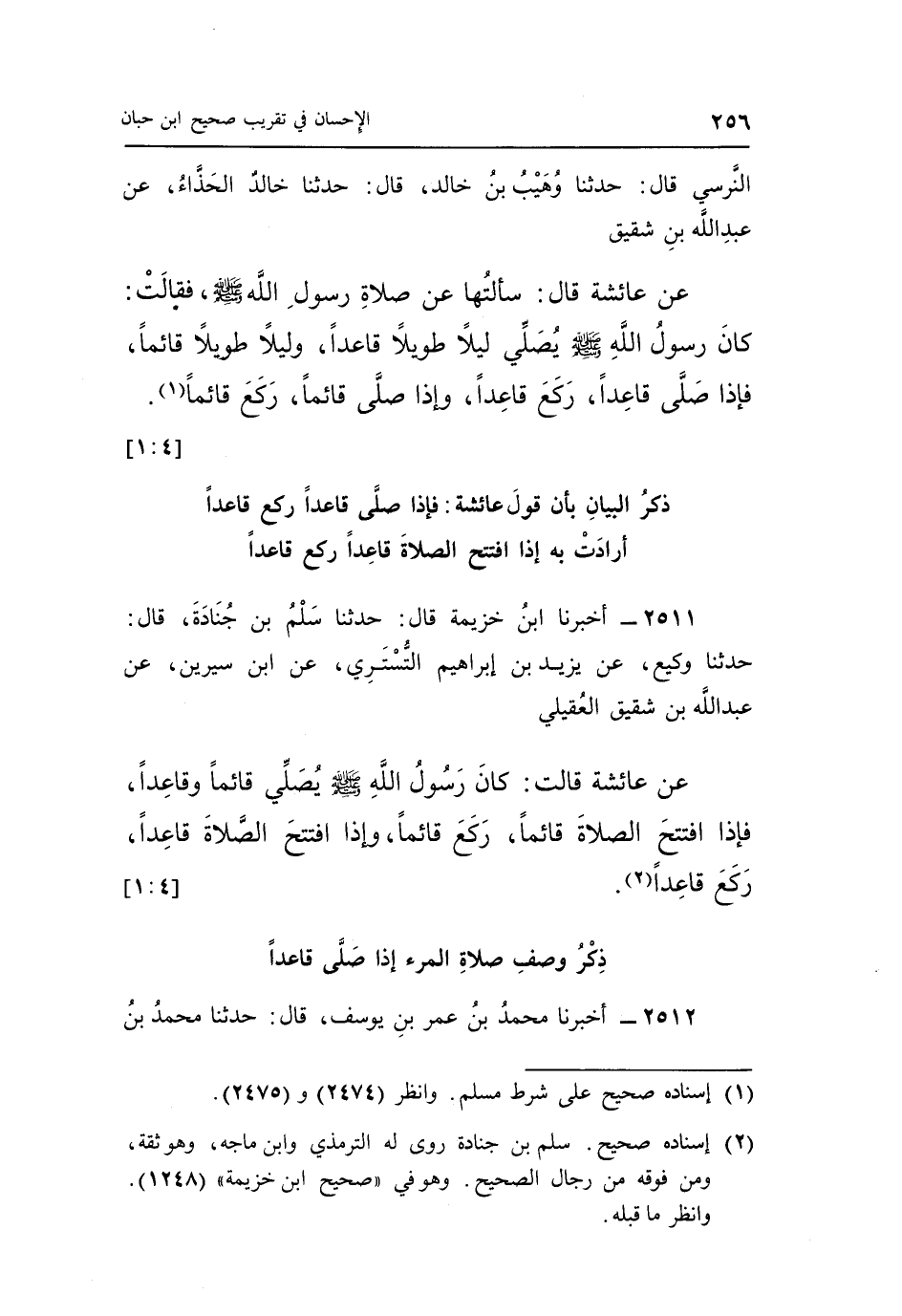 2511 - أَخْبَرَنَا ابْنُ خُزَيْمَةَ، قَالَ: حَدَّثَنَا سَلْمُ بْنُ جُنَادَةَ، قَالَ: حَدَّثَنَا وَكِيعٌ، عَنْ يَزِيدَ بْنِ إِبْرَاهِيمَ التُّسْتَرِيِّ، عَنِ ابْنِ سِيرِينَ، عَنْ عَبْدِ اللَّهِ بْنِ شَقِيقٍ الْعُقَيْلِيِّ، عَنْ عَائِشَةَ، قَالَتْ: «كَانَ رَسُولُ اللَّهِ صَلَّى اللَّهُ عَلَيْهِ وَسَلَّمَ يُصَلِّي قَائِمًا وَقَاعِدًا، فَإِذَا افْتَتَحَ الصَّلَاةَ قَائِمًا رَكَعَ قَائِمًا، وَإِذَا افْتَتَحَ الصَّلَاةَ قَاعِدًا رَكَعَ قَاعِدًا» (¬2) . [4: 1]
