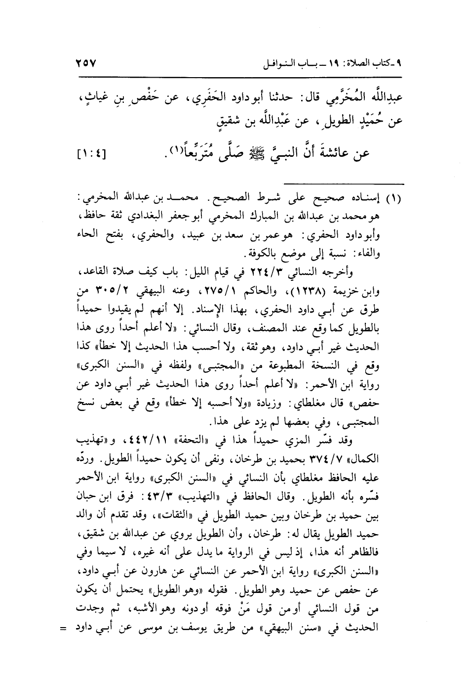 عَبْدِ اللَّهِ الْمُخَرِّمِيُّ، قَالَ: حَدَّثَنَا أَبُو دَاوُدَ الْحَفَرِيُّ، عَنْ حَفْصِ بْنِ غِيَاثٍ، عَنْ حُمَيْدٍ الطَّوِيلِ، عَنْ عَبْدِ اللَّهِ بْنِ شَقِيقٍ، عَنْ عَائِشَةَ، «أَنَّ النَّبِيَّ صَلَّى اللَّهُ عَلَيْهِ وَسَلَّمَ صَلَّى مُتَرَبِّعًا» (¬1) . [4: 1]