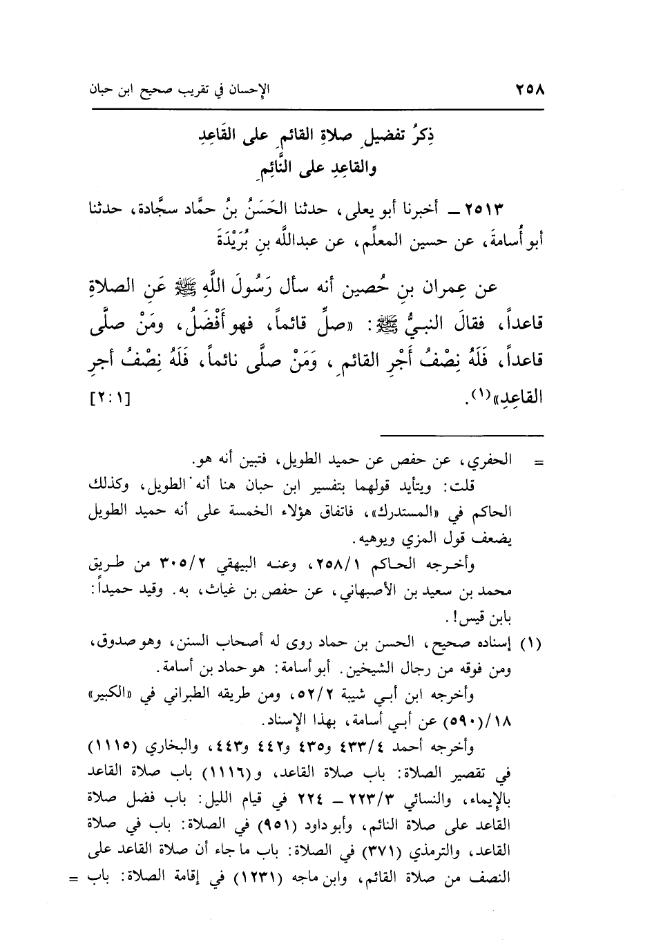 2513 - أَخْبَرَنَا أَبُو يَعْلَى، حَدَّثَنَا الْحَسَنُ بْنُ حَمَّادٍ سَجَّادَةُ، حَدَّثَنَا أَبُو أُسَامَةَ، عَنْ حُسَيْنٍ الْمُعَلِّمِ، عَنْ عَبْدِ اللَّهِ بْنِ بُرَيْدَةَ، عَنْ عِمْرَانَ بْنِ حُصَيْنٍ، أَنَّهُ سَأَلَ رَسُولَ اللَّهِ صَلَّى اللَّهُ عَلَيْهِ وَسَلَّمَ عَنِ الصَّلَاةِ قَاعِدًا، فَقَالَ النَّبِيُّ صَلَّى اللَّهُ عَلَيْهِ وَسَلَّمَ: «صَلِّ قَائِمًا، فَهُوَ أَفْضَلُ، وَمَنْ صَلَّى قَاعِدًا فَلَهُ نِصْفُ أَجْرِ الْقَائِمِ، وَمَنْ صَلَّى نَائِمًا فَلَهُ نِصْفُ أَجْرِ الْقَاعِدِ» (¬1) . [1: 2]