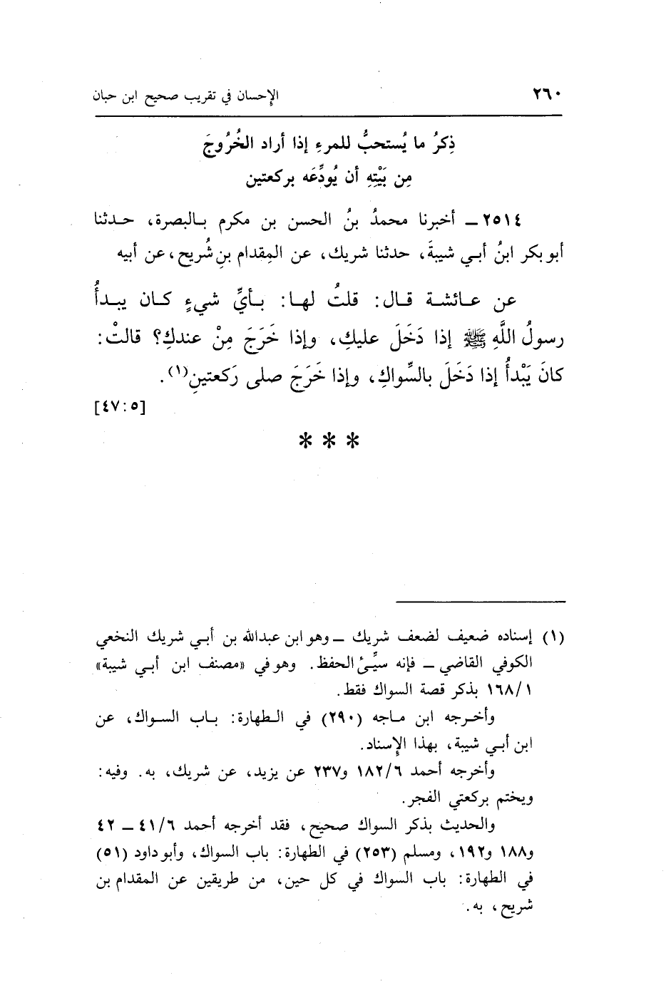 2514 - أَخْبَرَنَا مُحَمَّدُ بْنُ الْحَسَنِ بْنِ مُكْرَمٍ بِالْبَصْرَةِ، حَدَّثَنَا أَبُو بَكْرِ بْنُ أَبِي شَيْبَةَ، حَدَّثَنَا شَرِيكٌ، عَنِ الْمِقْدَامِ بْنِ شُرَيْحٍ، عَنْ أَبِيهِ، عَنْ عَائِشَةَ، قَالَ: قُلْتُ لَهَا: بِأَيِّ شَيْءٍ كَانَ يَبْدَأُ رَسُولُ اللَّهِ صَلَّى اللَّهُ عَلَيْهِ وَسَلَّمَ إِذَا دَخَلَ عَلَيْكِ، وَإِذَا خَرَجَ مِنْ عِنْدِكِ؟ قَالَتْ: «كَانَ يَبْدَأُ إِذَا دَخَلَ بِالسِّوَاكِ، وَإِذَا خَرَجَ صَلَّى رَكْعَتَيْنِ» (¬1) . [5: 47]