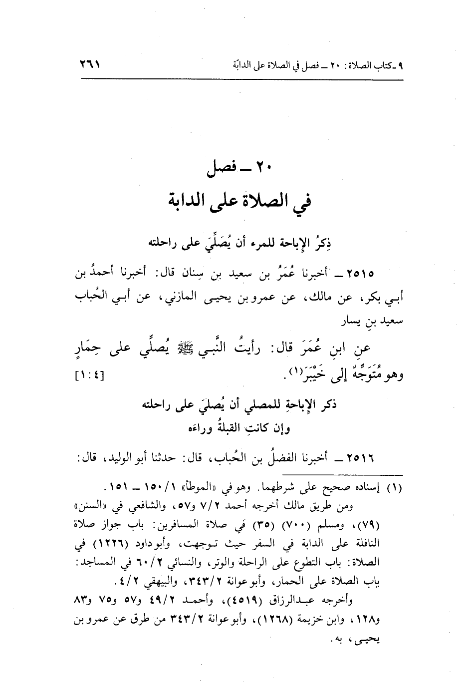 2515 - أَخْبَرَنَا عُمَرُ بْنُ سَعِيدِ بْنِ سِنَانٍ، قَالَ: أَخْبَرَنَا أَحْمَدُ بْنُ أَبِي بَكْرٍ، عَنْ مَالِكٍ، عَنْ عَمْرِو بْنِ يَحْيَى الْمَازِنِيِّ، عَنْ أَبِي الْحُبَابِ سَعِيدِ بْنِ يَسَارٍ، عَنِ ابْنِ عُمَرَ قَالَ: «رَأَيْتُ النَّبِيَّ صَلَّى اللَّهُ عَلَيْهِ وَسَلَّمَ يُصَلِّي عَلَى حِمَارٍ وَهُوَ مُتَوَجِّهٌ إِلَى خَيْبَرَ» (¬1) . [4: 1]