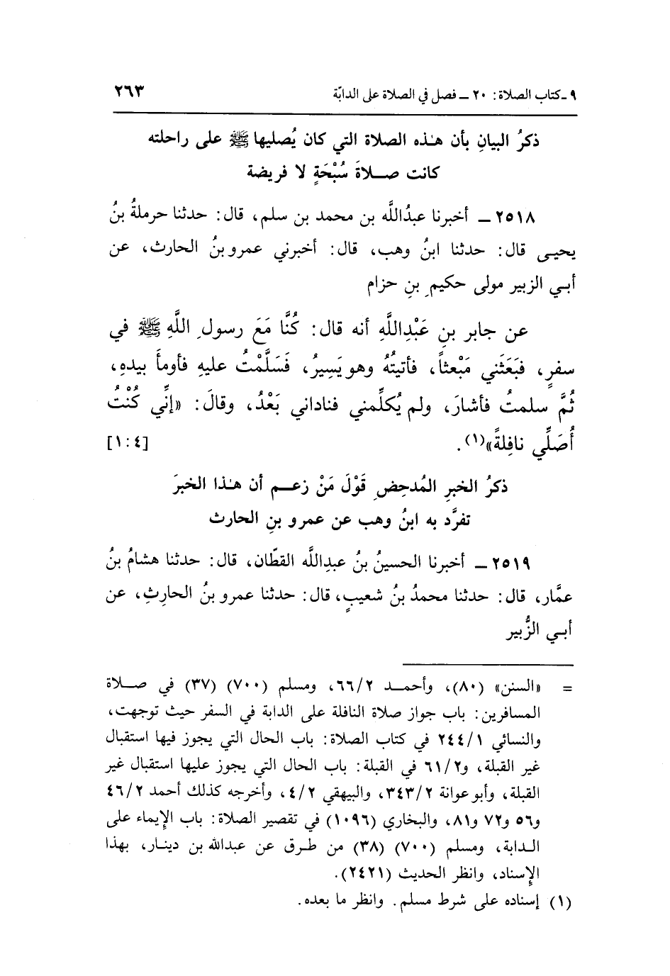2518 - أَخْبَرَنَا عَبْدُ اللَّهِ بْنُ مُحَمَّدِ بْنِ سَلْمٍ، قَالَ: حَدَّثَنَا حَرْمَلَةُ بْنُ يَحْيَى، قَالَ: حَدَّثَنَا ابْنُ وَهْبٍ، قَالَ: أَخْبَرَنِي عَمْرُو بْنُ الْحَارِثِ، عَنْ أَبِي الزُّبَيْرِ مَوْلَى حَكِيمِ بْنِ حِزَامٍ، عَنْ جَابِرِ بْنِ عَبْدِ اللَّهِ أَنَّهُ قَالَ: كُنَّا مَعَ رَسُولِ اللَّهِ صَلَّى اللَّهُ عَلَيْهِ وَسَلَّمَ فِي سَفَرٍ، فَبَعَثَنِي مَبْعَثًا، فَأَتَيْتُهُ وَهُوَ يَسِيرُ، فَسَلَّمْتُ عَلَيْهِ فَأَوْمَأَ بِيَدِهِ، ثُمَّ سَلَّمْتُ فَأَشَارَ وَلَمْ يُكَلِّمْنِي، فَنَادَانِي بَعْدُ وَقَالَ: «إِنِّي كُنْتُ أُصَلِّي نَافِلَةً» (¬1) . [4: 1]