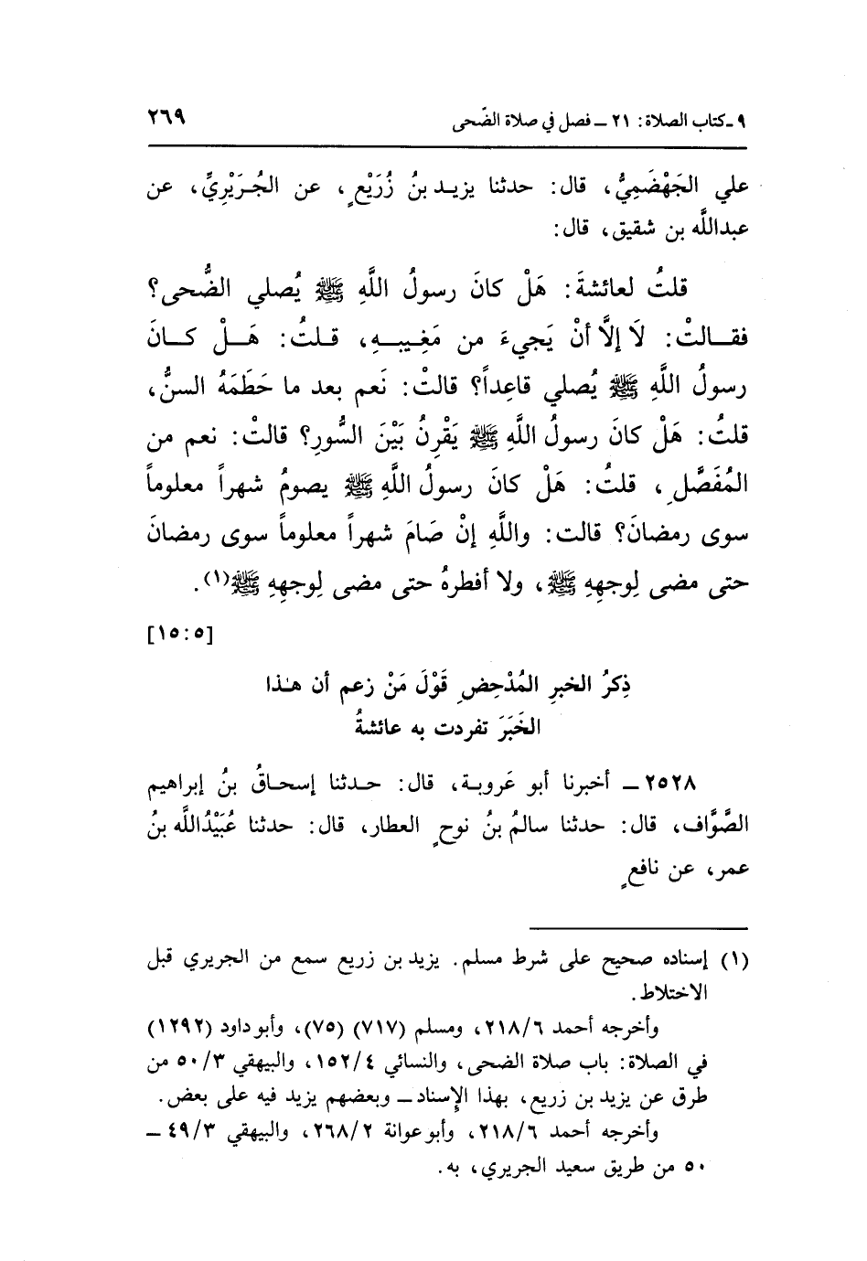 عَلِيٍّ الْجَهْضَمِيُّ، قَالَ: حَدَّثَنَا يَزِيدُ بْنُ زُرَيْعٍ، عَنِ الْجُرَيْرِيِّ، عَنْ عَبْدِ اللَّهِ بْنِ شَقِيقٍ، قَالَ: قُلْتُ لِعَائِشَةَ: هَلْ كَانَ رَسُولُ اللَّهِ صَلَّى اللَّهُ عَلَيْهِ وَسَلَّمَ يُصَلِّي الضُّحَى؟ فَقَالَتْ: «لَا، إِلَّا أَنْ يَجِيءَ مِنْ مَغِيبِهِ» قُلْتُ: هَلْ كَانَ رَسُولُ اللَّهِ صَلَّى اللَّهُ عَلَيْهِ وَسَلَّمَ يُصَلِّي قَاعِدًا؟ قَالَتْ: «نَعَمْ، بَعْدَمَا حَطَمَهُ السِّنُّ» قُلْتُ: هَلْ كَانَ رَسُولُ اللَّهِ صَلَّى اللَّهُ عَلَيْهِ وَسَلَّمَ يَقْرِنُ بَيْنَ السُّوَرِ؟ قَالَتْ: «نَعَمْ، مِنَ الْمُفَصَّلِ» قُلْتُ: هَلْ كَانَ رَسُولُ اللَّهِ صَلَّى اللَّهُ عَلَيْهِ وَسَلَّمَ يَصُومُ شَهْرًا مَعْلُومًا سِوَى رَمَضَانَ؟ قَالَتْ: «وَاللَّهِ إِنْ صَامَ شَهْرًا مَعْلُومًا سِوَى رَمَضَانَ حَتَّى مَضَى لِوَجْهِهِ صَلَّى اللَّهُ عَلَيْهِ وَسَلَّمَ، وَلَا أَفْطَرَهُ حَتَّى مَضَى لِوَجْهِهِ صَلَّى اللَّهُ عَلَيْهِ وَسَلَّمَ» (¬1) . [5: 15]