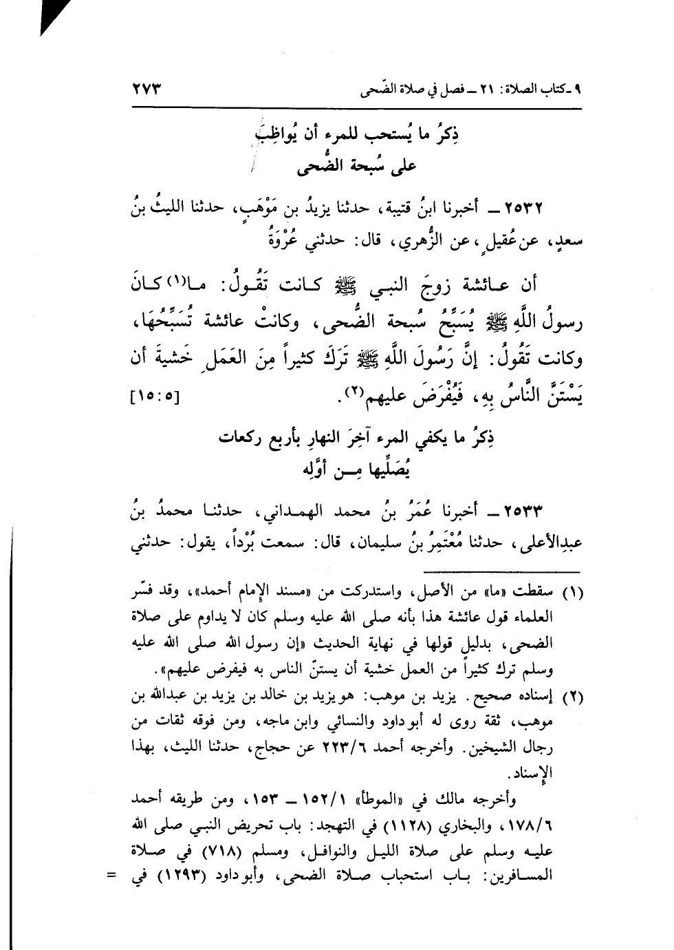 2532 - أَخْبَرَنَا ابْنُ قُتَيْبَةَ، حَدَّثَنَا يَزِيدُ بْنُ مَوْهَبٍ، حَدَّثَنَا اللَّيْثُ بْنُ سَعْدٍ، عَنْ عَقِيلٍ، عَنِ الزُّهْرِيِّ، قَالَ: حَدَّثَنِي عُرْوَةُ، أَنَّ عَائِشَةَ زَوْجَ النَّبِيِّ صَلَّى اللَّهُ عَلَيْهِ وَسَلَّمَ كَانَتْ تَقُولُ: «مَا (¬1) كَانَ رَسُولُ اللَّهِ صَلَّى اللَّهُ عَلَيْهِ وَسَلَّمَ يُسَبِّحُ سُبْحَةَ الضُّحَى» ، وَكَانَتْ عَائِشَةُ تُسَبِّحُهَا، وَكَانَتْ تَقُولُ: «إِنَّ رَسُولَ اللَّهِ صَلَّى اللَّهُ عَلَيْهِ وَسَلَّمَ تَرَكَ كَثِيرًا مِنَ الْعَمَلِ خَشْيَةَ أَنْ يَسْتَنَّ النَّاسُ بِهِ، فَيُفْرَضَ عَلَيْهِمْ» (¬2) . [5: 15]