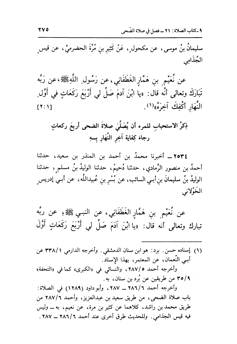 سُلَيْمَانُ بْنُ مُوسَى، عَنْ مَكْحُولٍ، عَنْ كَثِيرِ بْنِ مُرَّةَ الْحَضْرَمِيِّ، عَنْ قَيْسٍ الْجُذَامِيِّ، عَنْ نُعَيْمِ بْنِ هَمَّارٍ الْغَطَفَانِيِّ، عَنْ رَسُولِ اللَّهِ صَلَّى اللَّهُ عَلَيْهِ وَسَلَّمَ، عَنْ رَبِّهِ تَبَارَكَ وَتَعَالَى أَنَّهُ قَالَ: «يَا ابْنَ آدَمَ، صَلِّ لِي أَرْبَعَ رَكَعَاتٍ فِي أَوَّلِ النَّهَارِ أَكْفِكَ آخِرَهُ» (¬1) . [1: 2]