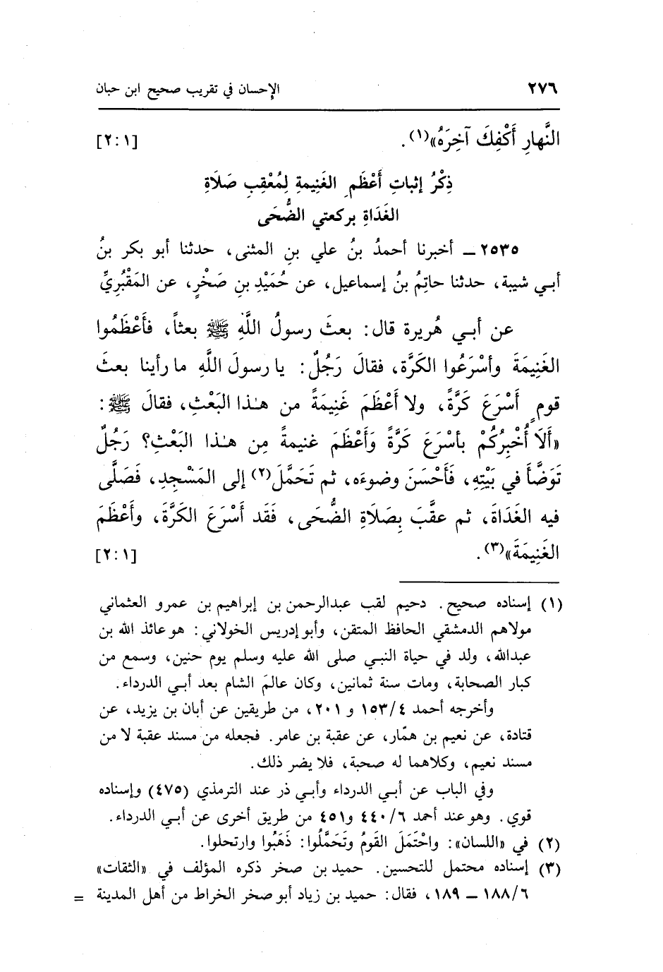 2535 - أَخْبَرَنَا أَحْمَدُ بْنُ عَلِيِّ بْنِ الْمُثَنَّى، حَدَّثَنَا أَبُو بَكْرِ بْنُ أَبِي شَيْبَةَ، حَدَّثَنَا حَاتِمُ بْنُ إِسْمَاعِيلَ، عَنْ حُمَيْدِ بْنِ صَخْرٍ، عَنِ الْمَقْبُرِيِّ، عَنْ أَبِي هُرَيْرَةَ قَالَ: بَعَثَ رَسُولُ اللَّهِ صَلَّى اللَّهُ عَلَيْهِ وَسَلَّمَ بَعْثًا فَأَعْظَمُوا الْغَنِيمَةَ وَأَسْرَعُوا الْكَرَّةَ، فَقَالَ رَجُلٌ: يَا رَسُولَ اللَّهِ، مَا رَأَيْنَا بَعْثَ قَوْمٍ أَسْرَعَ كَرَّةً، وَلَا أَعْظَمَ غَنِيمَةً، مِنْ هَذَا الْبَعْثِ، فَقَالَ صَلَّى اللَّهُ عَلَيْهِ وَسَلَّمَ: «أَلَا أُخْبِرُكُمْ بِأَسْرَعَ كَرَّةً وَأَعْظَمَ غَنِيمَةً مِنْ هَذَا الْبَعْثِ؟ رَجُلٌ تَوَضَّأَ فِي بَيْتِهِ فَأَحْسَنَ وُضُوءَهُ، ثُمَّ تَحَمَّلَ (¬2) إِلَى الْمَسْجِدِ، فَصَلَّى فِيهِ الْغَدَاةَ، ثُمَّ عَقَّبَ بِصَلَاةِ الضُّحَى، فَقَدْ أَسْرَعَ الْكَرَّةَ، وَأَعْظَمَ الْغَنِيمَةَ» (¬3) . [1: 2]