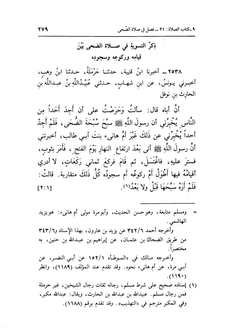 2538 - أَخْبَرَنَا ابْنُ قُتَيْبَةَ، حَدَّثَنَا حَرْمَلَةُ، حَدَّثَنَا ابْنُ وَهْبٍ، أَخْبَرَنِي يُونُسُ، عَنِ ابْنِ شِهَابٍ، حَدَّثَنِي عُبَيْدُ اللَّهِ بْنُ عَبْدِ اللَّهِ بْنِ الْحَارِثِ بْنِ نَوْفَلٍ، أَنَّ أَبَاهُ قَالَ: سَأَلْتُ وَحَرَصْتُ عَلَى أَنْ أَجِدَ أَحَدًا مِنَ النَّاسِ يُخْبِرُنِي، أَنَّ رَسُولَ اللَّهِ صَلَّى اللَّهُ عَلَيْهِ وَسَلَّمَ سَبَّحَ سُبْحَةَ الضُّحَى، فَلَمْ أَجِدْ أَحَدًا يُخْبِرُنِي عَنْ ذَلِكَ غَيْرَ أُمِّ هَانِئٍ بِنْتِ أَبِي طَالِبٍ، أَخْبَرَتْنِي «أَنَّ رَسُولَ اللَّهِ صَلَّى اللَّهُ عَلَيْهِ وَسَلَّمَ أَتَى بَعْدَ ارْتِفَاعِ النَّهَارِ يَوْمَ الْفَتْحِ، فَأَمَرَ بِثَوْبٍ، فَسُتِرَ عَلَيْهِ، فَاغْتَسَلَ ثُمَّ قَامَ فَرَكَعَ ثَمَانِيَ رَكَعَاتٍ، لَا أَدْرِي أَقِيَامُهُ فِيهَا أَطْوَلُ أَمْ رُكُوعُهُ أَمْ سُجُودُهُ، كُلُّ ذَلِكَ مُتَقَارِبَةٌ» ، قَالَتْ: «فَلَمْ أَرَهُ سَبَّحَهَا قَبْلُ وَلَا بَعْدُ» (¬1) . [1: 2]