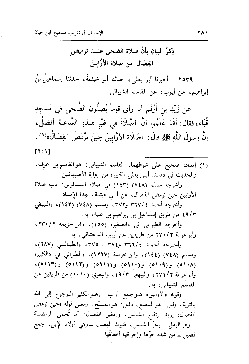 2539 - أَخْبَرَنَا أَبُو يَعْلَى، حَدَّثَنَا أَبُو خَيْثَمَةَ، حَدَّثَنَا إِسْمَاعِيلُ بْنُ إِبْرَاهِيمَ، عَنْ أَيُّوبَ، عَنِ الْقَاسِمِ الشَّيْبَانِيِّ، عَنْ زَيْدِ بْنِ أَرْقَمَ أَنَّهُ رَأَى قَوْمًا يُصَلُّونَ الضُّحَى فِي مَسْجِدِ قُبَاءَ، فَقَالَ: لَقَدْ عَلِمُوا أَنَّ الصَّلَاةَ فِي غَيْرِ هَذِهِ السَّاعَةِ أَفْضَلُ، إِنَّ رَسُولَ اللَّهِ صَلَّى اللَّهُ عَلَيْهِ وَسَلَّمَ قَالَ: «صَلَاةُ الْأَوَّابِينَ حِينَ تَرْمَضُ الْفِصَالُ» (¬1) . [1: 2]
