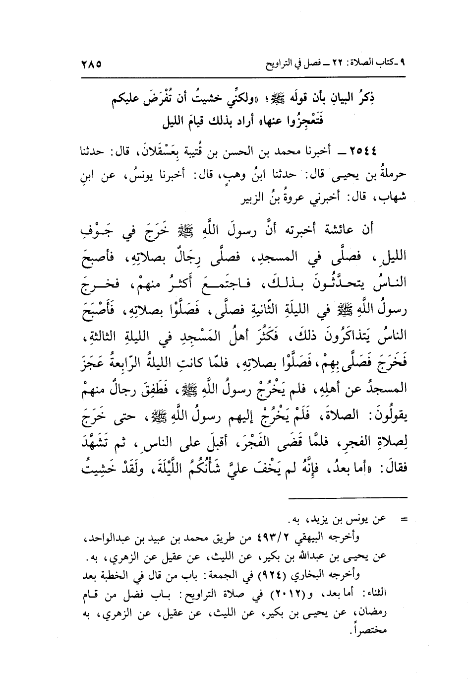 2544 - أَخْبَرَنَا مُحَمَّدُ بْنُ الْحَسَنِ بْنِ قُتَيْبَةَ بِعَسْقَلَانَ، قَالَ: حَدَّثَنَا حَرْمَلَةُ بْنُ يَحْيَى، قَالَ: حَدَّثَنَا ابْنُ وَهْبٍ، قَالَ: أَخْبَرَنَا يُونُسُ، عَنِ ابْنِ شِهَابٍ، قَالَ: أَخْبَرَنِي عُرْوَةُ بْنُ الزُّبَيْرِ، أَنَّ عَائِشَةَ أَخْبَرَتْهُ، أَنَّ رَسُولَ اللَّهِ صَلَّى اللَّهُ عَلَيْهِ وَسَلَّمَ خَرَجَ فِي جَوْفِ اللَّيْلِ، فَصَلَّى فِي الْمَسْجِدِ، فَصَلَّى رِجَالٌ بِصَلَاتِهِ، فَأَصْبَحَ النَّاسُ يَتَحَدَّثُونَ بِذَلِكَ، فَاجْتَمَعَ أَكْثَرُ مِنْهُمْ، فَخَرَجَ رَسُولُ اللَّهِ صَلَّى اللَّهُ عَلَيْهِ وَسَلَّمَ فِي اللَّيْلَةِ الثَّانِيَةِ فَصَلَّى، فَصَلَّوْا بِصَلَاتِهِ، فَأَصْبَحَ النَّاسُ يَتَذَاكَرُونَ ذَلِكَ، فَكَثُرَ أَهْلُ الْمَسْجِدِ فِي اللَّيْلَةِ الثَّالِثَةِ، فَخَرَجَ فَصَلَّى بِهِمْ، فَصَلَّوْا بِصَلَاتِهِ، فَلَمَّا كَانَتِ اللَّيْلَةُ الرَّابِعَةُ عَجَزَ الْمَسْجِدُ عَنْ أَهْلِهِ، فَلَمْ يَخْرُجْ رَسُولُ اللَّهِ صَلَّى اللَّهُ عَلَيْهِ وَسَلَّمَ، فَطَفِقَ رِجَالٌ مِنْهُمْ يَقُولُونَ: الصَّلَاةَ، فَلَمْ يَخْرُجْ إِلَيْهِمْ رَسُولُ اللَّهِ صَلَّى اللَّهُ عَلَيْهِ وَسَلَّمَ حَتَّى خَرَجَ لِصَلَاةِ الْفَجْرِ، فَلَمَّا قَضَى الْفَجْرَ أَقْبَلَ عَلَى النَّاسِ، ثُمَّ تَشَهَّدَ فَقَالَ: «أَمَّا بَعْدُ، فَإِنَّهُ لَمْ يَخْفَ عَلَيَّ شَأْنُكُمُ اللَّيْلَةَ، وَلَقَدْ خَشِيتُ